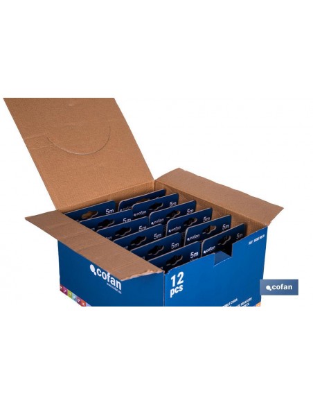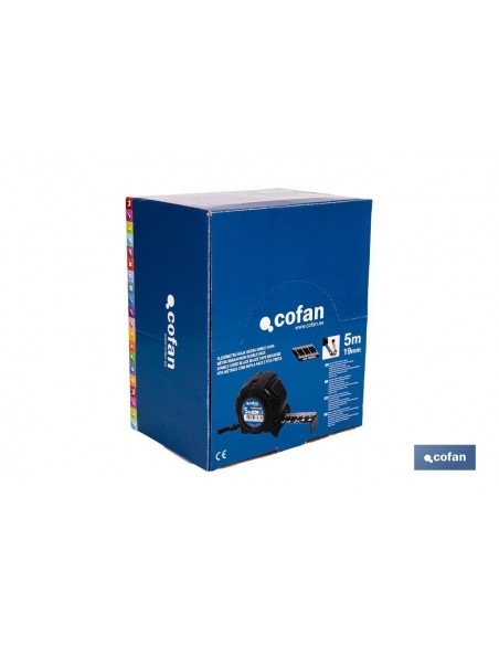 Expositor para flexómetros con hoja de nylon, en color negro e impresión en blanco, con doble cara de Cofan, una herramienta esencial para cualquier ferretería o tienda de suministros industriales que busca ofrecer a sus clientes productos de medición de alta calidad y durabilidad. Estos expositores vienen equipados con 12 o 6 flexómetros, según las características del flexómetro. Están diseñados para soportar las condiciones más exigentes, proporcionando precisión y resistencia. Están fabricados en cartón y cuentan con unas medidas de: 04500949 (17,8 x 24,2 x 13,3 cm), 04500950 y 04500951 (21,8 x 26,5 x 15,3 cm), 04500952 y 04500953 (21,8 x 15,6 x 15,3 cm). El expositor en sí está diseñado para ser compacto y eficiente, permitiendo una fácil organización y acceso a los flexómetros. Con capacidad para 12 o 6 unidades, es perfecto para mostradores de tiendas, asegurando que los clientes puedan ver y acceder fácilmente a los productos.Características del flexómetro con hoja de nylon de color negro e impresión en blanco con doble cara de Cofan.Cada flexómetro en el expositor cuenta con una carcasa de ABS negra y resistente, envuelta de caucho antichoque, lo que proporciona una protección superior. Esta característica es crucial para prevenir daños causados por caídas o golpes, asegurando que el flexómetro mantenga su precisión y funcionalidad a lo largo del tiempo.Están equipados con un pulsador de bloqueo de la hoja que permite una fijación segura durante el uso. Además, incluyen un muelle de alto rendimiento que hace que la hoja se desenganche lentamente y sea segura. Estos mecanismos aseguran que la hoja no se retraiga inesperadamente, proporcionando mediciones precisas y seguras en todo momento.Las hojas del flexómetro son de 16 mm, 19 mm o 25 mm de ancho. Están fabricadas con envoltura de nylon y recubiertas en color negro mate con la impresión en blanco con alta visibilidad a doble cara, lo que facilita la lectura en lugares oscuros. La hoja de estos flexómetros cuenta con un 40% más de grosor que las normales, haciendo que estos flexómetros sean mucho más resistentes al agua.Además, el gancho normal (no magnético) en el extremo de la hoja asegura una sujeción firme y estable en cualquier superficie, permitiendo mediciones precisas en diversas situaciones.La longitud del flexómetro puede ser de 3 m, 5 m u 8 m.Incluyen una correa para colgar, lo que facilita su transporte y uso en el lugar de trabajo.