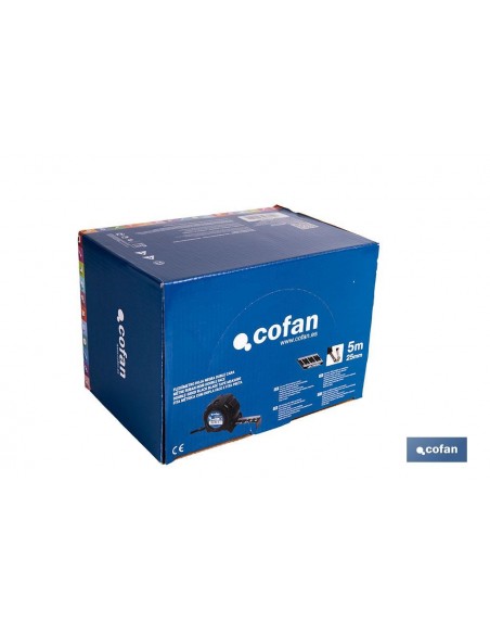 Expositor para flexómetros con hoja de nylon, en color negro e impresión en blanco, con doble cara de Cofan, una herramienta esencial para cualquier ferretería o tienda de suministros industriales que busca ofrecer a sus clientes productos de medición de alta calidad y durabilidad. Estos expositores vienen equipados con 12 o 6 flexómetros, según las características del flexómetro. Están diseñados para soportar las condiciones más exigentes, proporcionando precisión y resistencia. Están fabricados en cartón y cuentan con unas medidas de: 04500949 (17,8 x 24,2 x 13,3 cm), 04500950 y 04500951 (21,8 x 26,5 x 15,3 cm), 04500952 y 04500953 (21,8 x 15,6 x 15,3 cm). El expositor en sí está diseñado para ser compacto y eficiente, permitiendo una fácil organización y acceso a los flexómetros. Con capacidad para 12 o 6 unidades, es perfecto para mostradores de tiendas, asegurando que los clientes puedan ver y acceder fácilmente a los productos.Características del flexómetro con hoja de nylon de color negro e impresión en blanco con doble cara de Cofan.Cada flexómetro en el expositor cuenta con una carcasa de ABS negra y resistente, envuelta de caucho antichoque, lo que proporciona una protección superior. Esta característica es crucial para prevenir daños causados por caídas o golpes, asegurando que el flexómetro mantenga su precisión y funcionalidad a lo largo del tiempo.Están equipados con un pulsador de bloqueo de la hoja que permite una fijación segura durante el uso. Además, incluyen un muelle de alto rendimiento que hace que la hoja se desenganche lentamente y sea segura. Estos mecanismos aseguran que la hoja no se retraiga inesperadamente, proporcionando mediciones precisas y seguras en todo momento.Las hojas del flexómetro son de 16 mm, 19 mm o 25 mm de ancho. Están fabricadas con envoltura de nylon y recubiertas en color negro mate con la impresión en blanco con alta visibilidad a doble cara, lo que facilita la lectura en lugares oscuros. La hoja de estos flexómetros cuenta con un 40% más de grosor que las normales, haciendo que estos flexómetros sean mucho más resistentes al agua.Además, el gancho normal (no magnético) en el extremo de la hoja asegura una sujeción firme y estable en cualquier superficie, permitiendo mediciones precisas en diversas situaciones.La longitud del flexómetro puede ser de 3 m, 5 m u 8 m.Incluyen una correa para colgar, lo que facilita su transporte y uso en el lugar de trabajo.