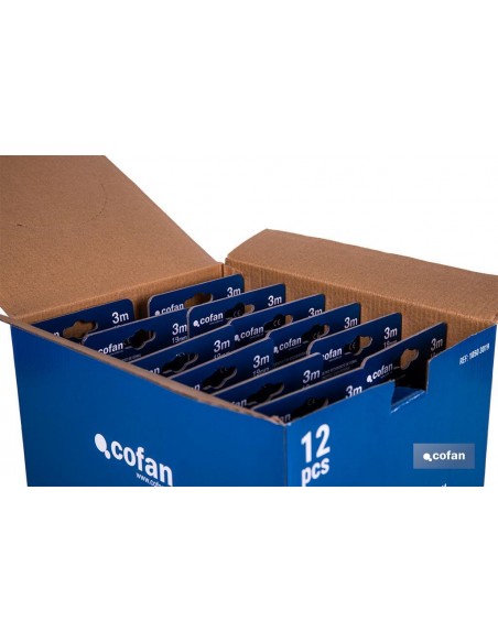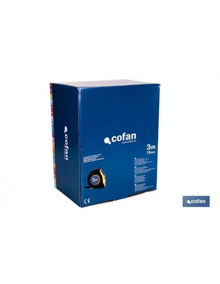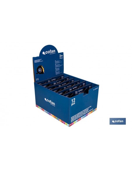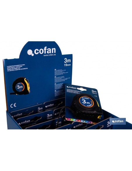 Expositor para flexómetros con protección de goma de Cofan, una herramienta esencial para cualquier ferretería o tienda de suministros industriales que busca ofrecer a sus clientes productos de medición de alta calidad y durabilidad. Estos expositores vienen equipados con 12 o 6 flexómetros, según las características del flexómetro. Están diseñados para soportar las condiciones más exigentes, proporcionando precisión y resistencia. Están fabricados en cartón y cuentan con unas medidas de: 04500934 (21,8 x 27,5 x 15,3 cm), 04500935 (21,8 x 27,5 x 15,3 cm), 04500936 (21,8 x 15,6 x 15,3 cm), 04500937 (21,8 x 16,9 x 15,3 cm) y 04500938 (21,8 x 18,5 x 15,3 cm). El expositor en sí está diseñado para ser compacto y eficiente, permitiendo una fácil organización y acceso a los flexómetros. Con capacidad para 12 o 6 unidades, es perfecto para mostradores de tiendas, asegurando que los clientes puedan ver y acceder fácilmente a los productos.Características del flexómetro con protección de goma de Cofan.Cada flexómetro en el expositor cuenta con una carcasa resistente de ABS recubierta de goma, lo que proporciona una protección antichoque superior. Esta característica es crucial para prevenir daños causados por caídas o golpes, asegurando que el flexómetro mantenga su precisión y funcionalidad a lo largo del tiempo.Están equipados con un pulsador de bloqueo de la hoja que permite una fijación segura durante el uso. Este mecanismo asegura que la hoja no se retraiga inesperadamente, proporcionando mediciones precisas y seguras en todo momento.Las hojas del flexómetro son de 19 mm, 25 mm o 32 mm de ancho y está recubierta en color amarillo mate, lo que facilita la lectura en condiciones de poca luz. Además, el gancho en el extremo de la hoja asegura una sujeción firme y estable en cualquier superficie, permitiendo mediciones precisas en diversas situaciones. La longitud del flexómetro puede ser de 5 m, 8 m o 10 m.Incluyen una correa para colgar, lo que facilita su transporte y uso en el lugar de trabajo.