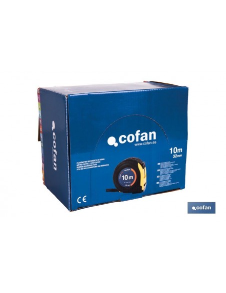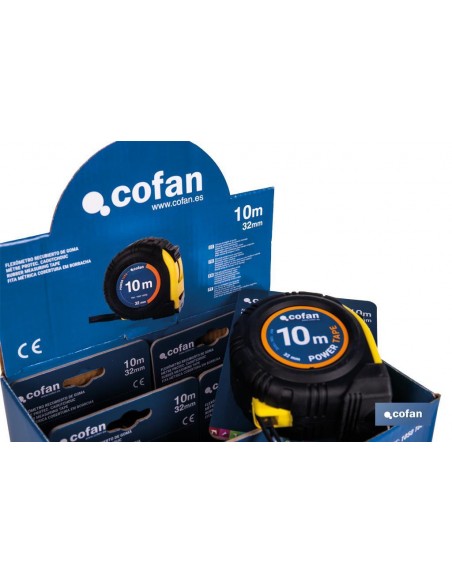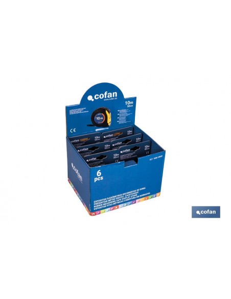 Expositor para flexómetros con protección de goma de Cofan, una herramienta esencial para cualquier ferretería o tienda de suministros industriales que busca ofrecer a sus clientes productos de medición de alta calidad y durabilidad. Estos expositores vienen equipados con 12 o 6 flexómetros, según las características del flexómetro. Están diseñados para soportar las condiciones más exigentes, proporcionando precisión y resistencia. Están fabricados en cartón y cuentan con unas medidas de: 04500934 (21,8 x 27,5 x 15,3 cm), 04500935 (21,8 x 27,5 x 15,3 cm), 04500936 (21,8 x 15,6 x 15,3 cm), 04500937 (21,8 x 16,9 x 15,3 cm) y 04500938 (21,8 x 18,5 x 15,3 cm). El expositor en sí está diseñado para ser compacto y eficiente, permitiendo una fácil organización y acceso a los flexómetros. Con capacidad para 12 o 6 unidades, es perfecto para mostradores de tiendas, asegurando que los clientes puedan ver y acceder fácilmente a los productos.Características del flexómetro con protección de goma de Cofan.Cada flexómetro en el expositor cuenta con una carcasa resistente de ABS recubierta de goma, lo que proporciona una protección antichoque superior. Esta característica es crucial para prevenir daños causados por caídas o golpes, asegurando que el flexómetro mantenga su precisión y funcionalidad a lo largo del tiempo.Están equipados con un pulsador de bloqueo de la hoja que permite una fijación segura durante el uso. Este mecanismo asegura que la hoja no se retraiga inesperadamente, proporcionando mediciones precisas y seguras en todo momento.Las hojas del flexómetro son de 19 mm, 25 mm o 32 mm de ancho y está recubierta en color amarillo mate, lo que facilita la lectura en condiciones de poca luz. Además, el gancho en el extremo de la hoja asegura una sujeción firme y estable en cualquier superficie, permitiendo mediciones precisas en diversas situaciones. La longitud del flexómetro puede ser de 5 m, 8 m o 10 m.Incluyen una correa para colgar, lo que facilita su transporte y uso en el lugar de trabajo.