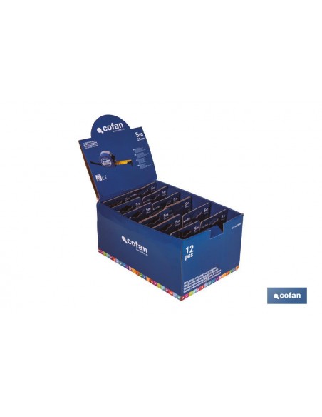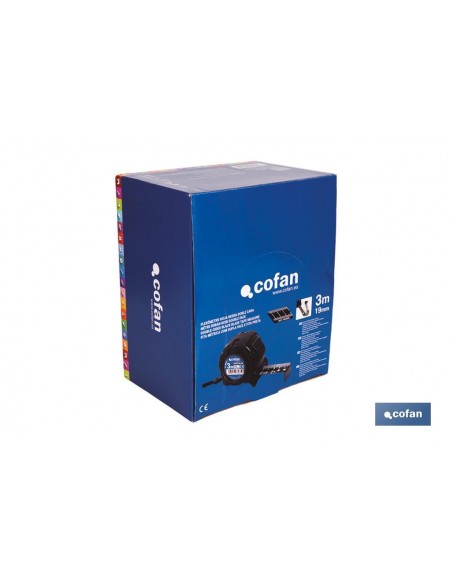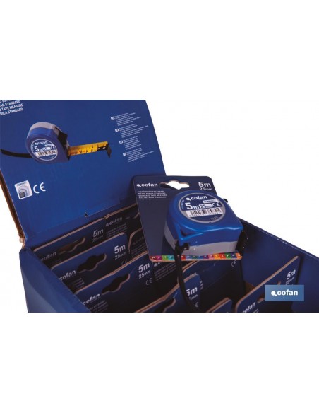 Expositor para flexómetros estándar con botón de bloqueo de la hoja de Cofan, una herramienta esencial para cualquier ferretería o tienda de suministros industriales que busca ofrecer a sus clientes productos de medición de alta calidad y durabilidad. Estos expositores vienen equipados con 12 o 6 flexómetros, según las características del flexómetro. Están diseñados para soportar las condiciones más exigentes, proporcionando precisión y resistencia. Están fabricados en cartón y cuentan con unas medidas de 04500945 (17,8 x 20,2 x 13,3 cm), 04500946 (17,8 x 23 x 13,3 cm), 04500947 (17,8 x 26,6 x 13,3 cm) y 04500948 (21,8 x 14,6 x 15,3 cm).El expositor en sí está diseñado para ser compacto y eficiente, permitiendo una fácil organización y acceso a los flexómetros. Con capacidad para 12 o 6 unidades, es perfecto para mostradores de tiendas, asegurando que los clientes puedan ver y acceder fácilmente a los productos.Características del flexómetro estándar de Cofan.Cada flexómetro en el expositor cuenta con una carcasa resistente de ABS, lo que proporciona una protección superior. Esta característica es crucial para prevenir daños causados por caídas o golpes, asegurando que el flexómetro mantenga su precisión y funcionalidad a lo largo del tiempo.Están equipados con un pulsador de bloqueo de la hoja que permite una fijación segura durante el uso. Además, incluyen un muelle de alto rendimiento que hace que la hoja se desenganche lentamente y sea segura. Estos mecanismos aseguran que la hoja no se retraiga inesperadamente, proporcionando mediciones precisas y seguras en todo momento.Las hojas del flexómetro son de 16 mm, 19 mm o 25 mm de ancho y está recubierta en color amarillo mate, lo que facilita la lectura en condiciones de poca luz. Además, el gancho normal (no magnético) en el extremo de la hoja asegura una sujeción firme y estable en cualquier superficie, permitiendo mediciones precisas en diversas situaciones. Cuenta con diseño lateral en ángulo recto para medición del diámetro interno.La longitud del flexómetro puede ser de 3 m, 5 m u 8 m.Incluyen una correa para colgar, lo que facilita su transporte y uso en el lugar de trabajo.