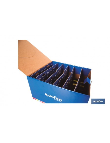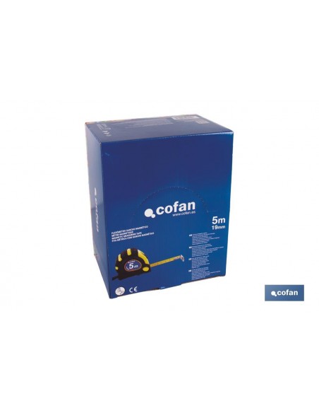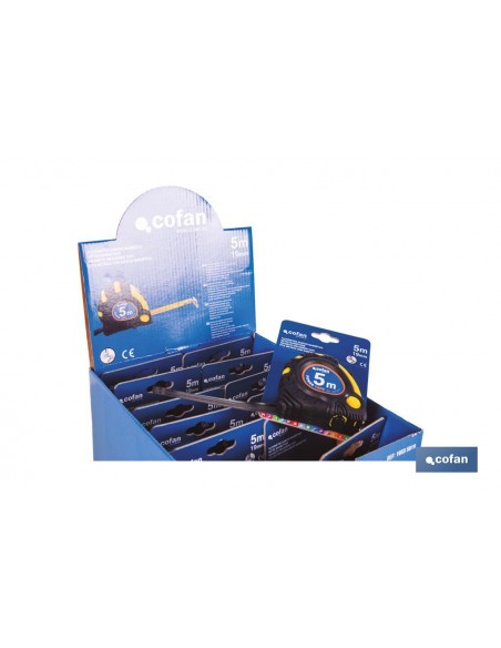Expositor para flexómetros recubiertos de goma con pulsador de bloqueo de hoja y gancho magnético de Cofan, una herramienta esencial para cualquier ferretería o tienda de suministros industriales que busca ofrecer a sus clientes productos de medición de alta calidad y durabilidad. Estos expositores vienen equipados con 12 o 6 flexómetros, según las características del flexómetro. Están diseñados para soportar las condiciones más exigentes, proporcionando precisión y resistencia. Están fabricados en cartón y cuentan con unas medidas de: 04500942 (26,6 x 17,8 x 13,5 cm), 04500943 (21,8 x 27,5 x 15,3 cm) y 04500944 (21,8 x 15,3 x 15,3 cm).El expositor en sí está diseñado para ser compacto y eficiente, permitiendo una fácil organización y acceso a los flexómetros. Con capacidad para 12 o 6 unidades, es perfecto para mostradores de tiendas, asegurando que los clientes puedan ver y acceder fácilmente a los productos.Características del flexómetro con protección de goma de Cofan.Cada flexómetro en el expositor cuenta con una carcasa resistente de ABS recubierta de goma, lo que proporciona una protección antichoque superior. Esta característica es crucial para prevenir daños causados por caídas o golpes, asegurando que el flexómetro mantenga su precisión y funcionalidad a lo largo del tiempo. El diseño clásico es ideal en ángulo recto para distintas mediciones.Están equipados con un pulsador de bloqueo de la hoja que permite una fijación segura durante el uso. Además, incluyen un muelle de alto rendimiento que hace que la hoja se desenganche lentamente y sea segura. Estos mecanismos aseguran que la hoja no se retraiga inesperadamente, proporcionando mediciones precisas y seguras en todo momento.Las hojas del flexómetro son de 16 mm, 19 mm o 25 mm de ancho y está recubierta en color amarillo mate, lo que facilita la lectura en condiciones de poca luz. Además, el gancho en el extremo de la hoja asegura una sujeción firme y estable en cualquier superficie, permitiendo mediciones precisas en diversas situaciones. La longitud del flexómetro puede ser de 3 m, 5 m u 8 m.Incluyen una correa para colgar, lo que facilita su transporte y uso en el lugar de trabajo.