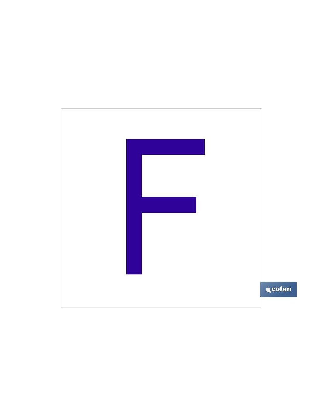 F Letra en glasspack adhesivo con el fondo blanco y carácter azul con medida en 62 x 62mm. El diseño de la señal puede variar, pero en ningún caso se variará el significado de la misma.