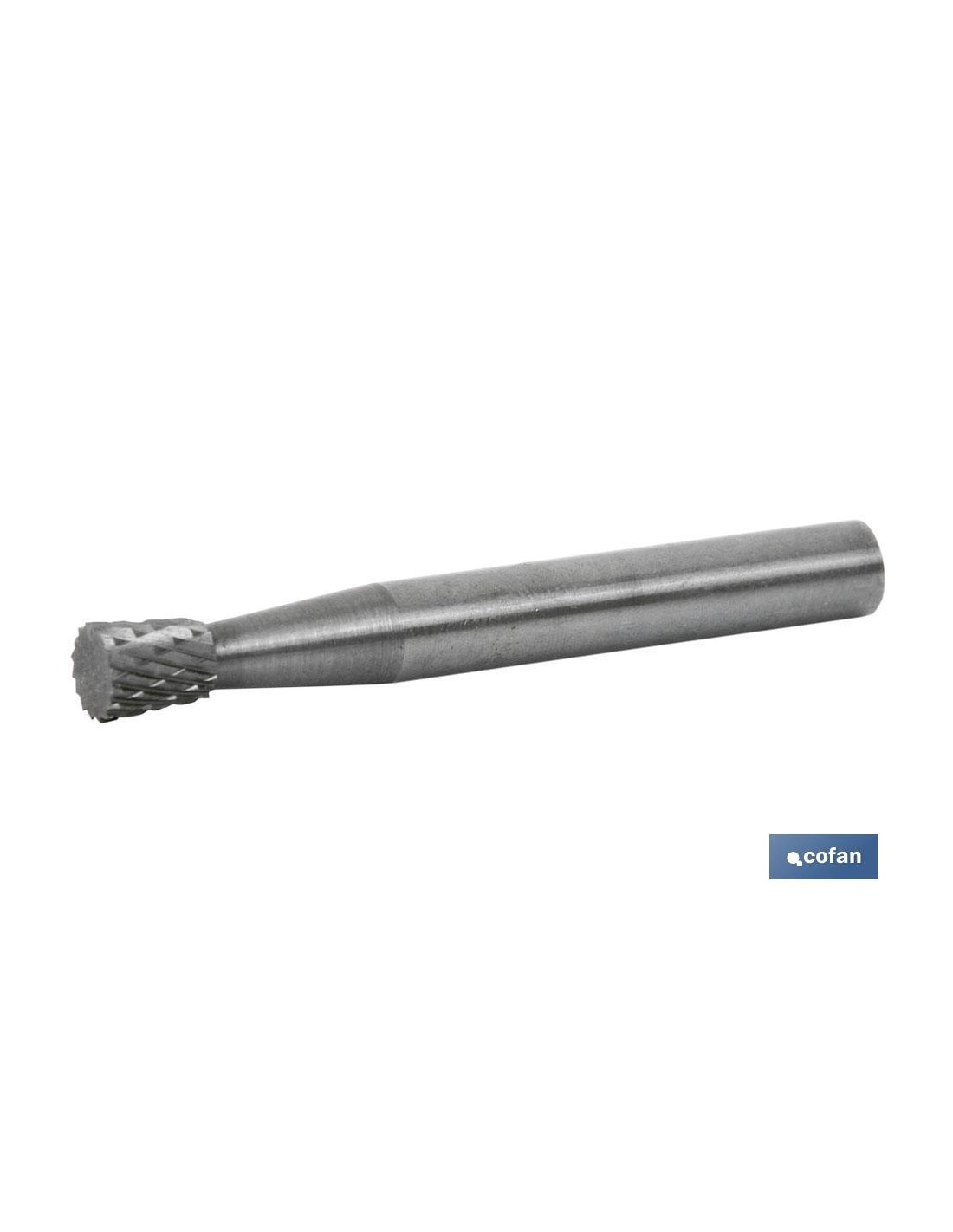 Fresa rotativa cónica invertida de metal duro y dentado cruzado, con punta cónica invertida sin dentado frontal y cabeza de 3 ó 6 mm de diámetro