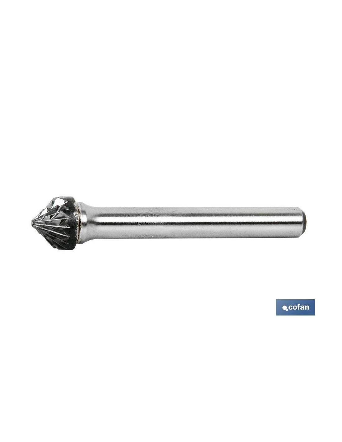 Fresa rotativa punta cónica 90° de metal duro y dentado cruzado, con punta en forma cónica de 90° y cabeza de 10 ó 16 mm de diámetro