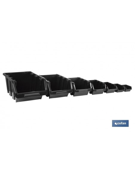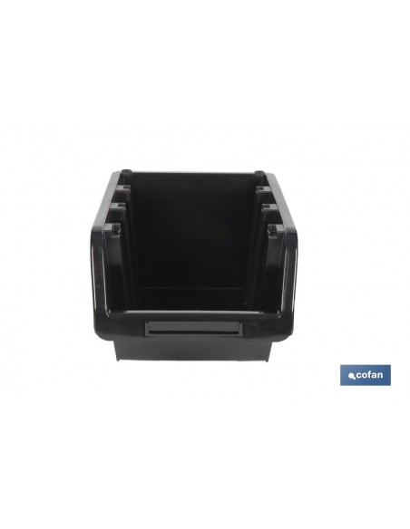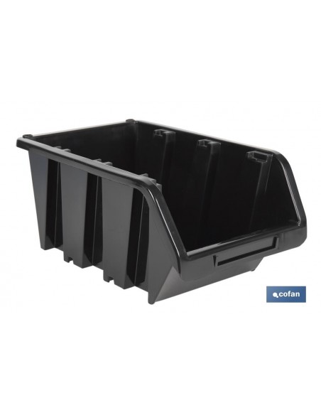 Gaveta apilable, disponible en color negro, para guardar elementos. Cuenta con una gran apertura para un crear un acceso más fácil al contenido. Con su amplia apertura frontal, estas gavetas permiten una carga y descarga rápida y sencilla de componentes, herramientas y materiales industriales, facilitando el acceso a las piezas almacenadas y mejorando la productividad en el entorno de trabajo. Se puede colgar en el carril de polipropileno de Cofan (referencia 09400771).Está fabricada en polipropileno especialmente resistente a impactos. Varias medidas y capacidades distintas.