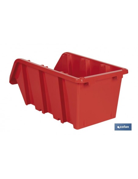 Gaveta apilable, disponible en color rojo, para guardar elementos. Cuenta con una gran apertura para crear un acceso más fácil al contenido. Con su amplia apertura frontal, estas gavetas permiten una carga y descarga rápida y sencilla de componentes, herramientas y materiales industriales, facilitando el acceso a las piezas almacenadas y mejorando la productividad en el entorno de trabajo. Se puede colgar en el carril de polipropileno de Cofan (referencia 09400771).Está fabricada en polipropileno especialmente resistente a impactos. Varias medidas y capacidades distintas.