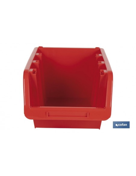 Gaveta apilable, disponible en color rojo, para guardar elementos. Cuenta con una gran apertura para crear un acceso más fácil al contenido. Con su amplia apertura frontal, estas gavetas permiten una carga y descarga rápida y sencilla de componentes, herramientas y materiales industriales, facilitando el acceso a las piezas almacenadas y mejorando la productividad en el entorno de trabajo. Se puede colgar en el carril de polipropileno de Cofan (referencia 09400771).Está fabricada en polipropileno especialmente resistente a impactos. Varias medidas y capacidades distintas.