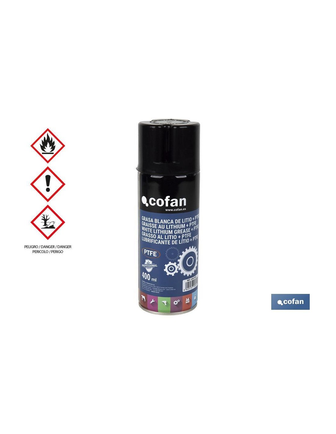 Grasa blanca de litio + PTFE de 400 ml. Grasa blanca en spray con aditivo y base de litio. Este producto se caracteriza por sus óptimas propiedades adhesivas, protectoras y deslizantes. Penetra en profundidad y garantiza una lubricación duradera. Amplio rango de temperatura y resistencia a la corrosión. Es resistente al agua y al calor. La película formada tras aplicar el producto impide que se adhiera polvo y suciedad, lo que favorece a la limpieza de las zonas de aplicación. Aerosol extremadamente inflamable. Recipiente a presión: puede reventar si se calienta. Provoca irritación cutánea y ocular grave. Puede provocar somnolencia o vértigo. Tóxico para los organismos acuáticos, con efectos nocivos duraderos. Evitar su liberación al medio ambiente. Mantener fuera del alcance de los niños. Mantener alejado de fuentes de calor, chispas, llamas abiertas o superficies caliente. No fumar. No pulverizar sobre una llama abierta u otra fuente de ignición. Recipiente a presión: no perforar ni quemar, aun después del uso. Proteger de la luz del sol. No exponer a temperaturas superiores a 50º C / 122º F. Contiene hidrocarburos C6 isoalcanos. Eliminar el contenido o recipiente conforme a la reglamentación regional.