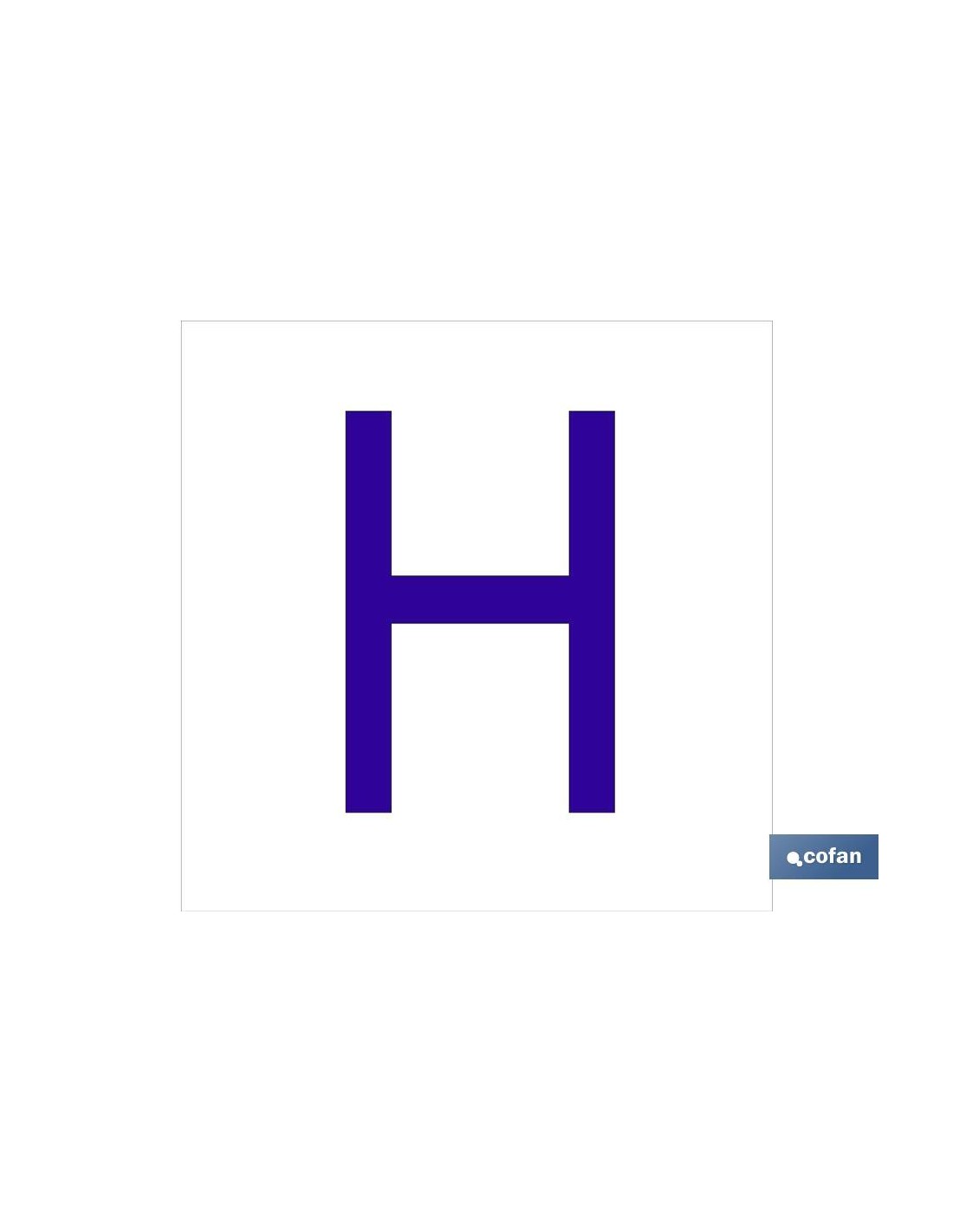 H Letra en glasspack adhesivo con el fondo blanco y carácter azul con medida en 62 x 62mm. El diseño de la señal puede variar, pero en ningún caso se variará el significado de la misma.