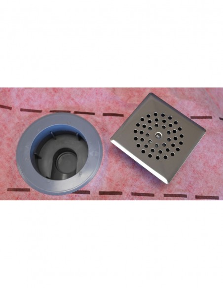 Está formado por un sumidero sifónico de perfil bajo, una pieza de lámina impermeable WATER-STOP unida y sellada de fábrica a un adaptador especial para su conexión al sumidero y por una rejilla de acero inoxidable con cazoleta de ABS.
