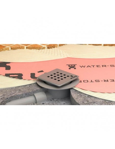 Está formado por un sumidero sifónico de perfil bajo, una pieza de lámina impermeable WATER-STOP unida y sellada de fábrica a un adaptador especial para su conexión al sumidero y por una rejilla de acero inoxidable con cazoleta de ABS.