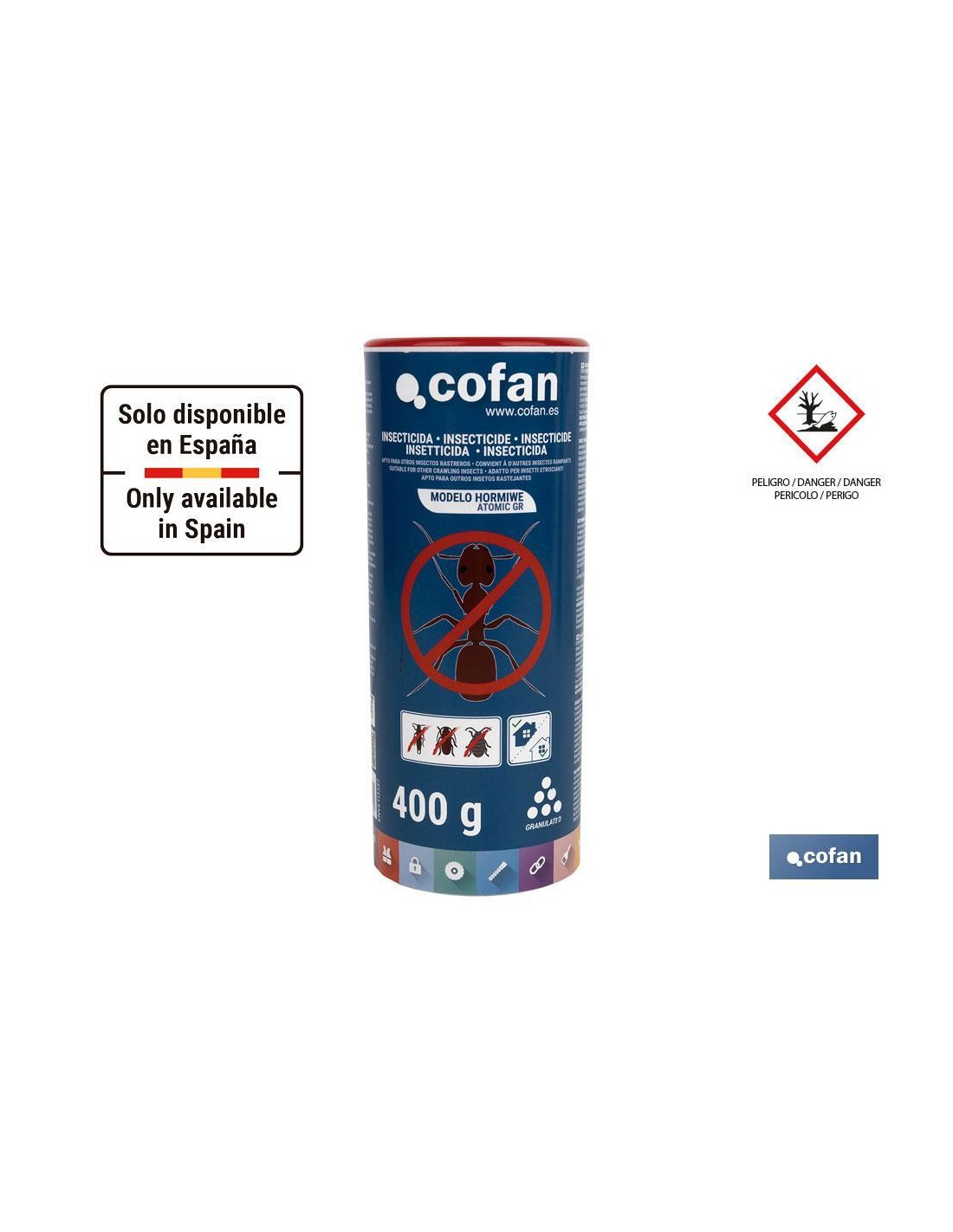 Insecticida en formato microgranulado que se aplica directamente al suelo para atraer y controlar las hormigas y otros rastreros. Especialmente para usar en el exterior y principalmente, en zonas amplias, como el jardín. Es muy resistente a la humedad, así que su aplicación es efectiva durante días. También controla todo tipo de insectos rastreros, como cucarachas, escarabajos, pececillo de plata, tijeretas, ciempiés... Su aplicación en talquera es muy cómoda, pues no se entra en contacto con el producto cuando se aplica. Bote de 400 g para uso doméstico. Indicaciones de peligro: H410: Muy tóxico para los organismos acuáticos, con efectos nocivos duraderos.