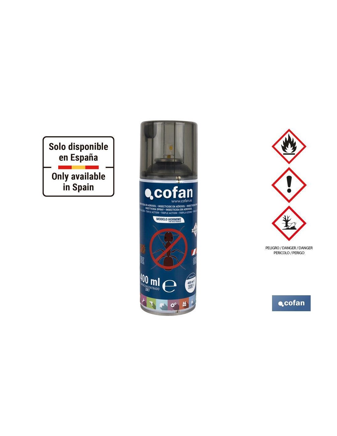 Insecticida en aerosol triple acción, muy eficaz, que controla de manera inmediata los insectos rastreros, eliminándolos y repeliéndolos. Para usar tanto en interior como en exterior. La formulación ha sido desarrollada para actuar contra hormigas, cucarachas, ácaros, arañas, ciempiés… Formato del bote en spray con 400 ml. Indicaciones de peligro: H222: aerosol extremadamente inflamable. H229: recipiente a presión: puede reventar si se calienta. H319: provoca irritación ocular grave. H410: muy toxico para los organismos acuáticos, con efectos nocivos duraderos. EUH066: la exposición repetida puede provocar sequedad y/o formación de grietas en la piel. EUH208: contiene permetrina. Puede provocar una reacción alérgica.