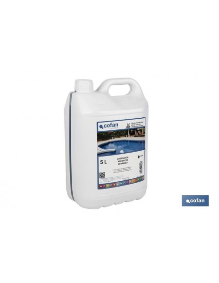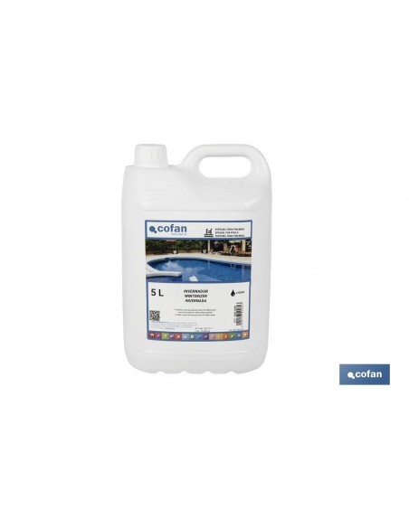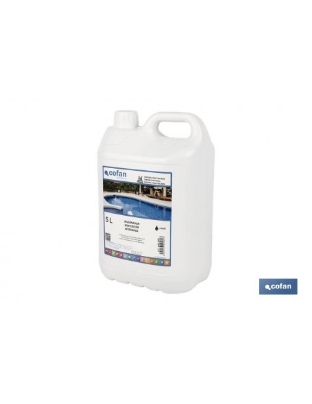 El invernador líquido para piscinas de 5 litros mantiene la piscina en perfectas condiciones durante los meses de invierno, asegurando que el agua se mantenga limpia y lista para usar cuando llegue la temporada de baño.Este invernador líquido tiene un potente efecto desinfectante que previene el crecimiento de microorganismos no deseados en tu piscina. Al utilizarlo, aseguras que el agua se mantenga clara y sin olores desagradables durante todo el periodo de hibernación.Gracias a su formulación avanzada, este producto impide el desarrollo de algas y hongos, que suelen proliferar en el agua estancada. Así, evitas el trabajo extra de limpiar la piscina en profundidad al inicio de la temporada.Puedes aplicar el invernador directamente en el agua de la piscina o diluirlo previamente. Su uso es sencillo y no requiere de conocimientos especializados. Además, no produce espuma, lo que facilita el mantenimiento y la limpieza posterior.Incluye instrucciones claras para su uso tanto en el tratamiento de preparación como en el tratamiento de mantenimiento. Esto asegura que la piscina esté bien protegida durante todo el invierno, sin importar las condiciones climáticas.Este invernador es adecuado para todo tipo de piscinas, ofreciendo una protección completa y eficiente.Modo de Empleo. Tratamiento de Preparación: asegura que el pH del agua esté entre 7,2 y 8 utilizando un kit de test de cloro y pH. Añade 2,5 kg de Cloro Choque por cada 100 m³ de agua y deja que la depuradora funcione durante un día para asegurar una disolución homogénea. Finalmente, añade 2-2,5 litros del invernador líquido por cada 50 m³ de agua a tratar.Tratamiento de Mantenimiento: Cada 2-3 meses, añade entre 2-2,5 litros de invernador líquido por cada 50 m³ de agua.Advertencias: mantén el producto fuera del alcance de los niños. Puede provocar irritación ocular grave (H319). Muy tóxico para los organismos acuáticos, con efectos nocivos duraderos (H400, H410).