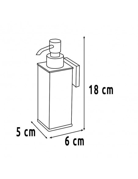 Dosificador de jabón fabricado en latón cromo. Sus medidas de ancho son 5 cm, fondo 6 cm, alto 18 cm. Fácil instalación con tornillos.