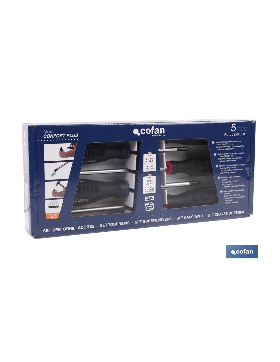 Juego de 3 destornilladores planos y 2 destornilladores Phillips, modelo Confort plus suministrados en un estuche de cartón. Con una punta magnética, los componentes y las piezas no se perderán. Puedes ahorrar mucho tiempo en la inserción de tornillos. El mango es de agarre antideslizante y cómodo. Fabricado en acero cromo vanadio y molibdeno con la varilla cromada que aseguran la durabilidad del destornillador. El material termoplástico asegura la resistencia al deslizamiento y el alto rendimiento de la empuñadura. Incluye 2 destornilladores Phillips: PH1 x 80 mm, PH2 x 100 mm y 3 destornilladores Planos: SL4,0 x 80 mm, SL5,5 x 125 mm y SL6,5 x 150 mm.
