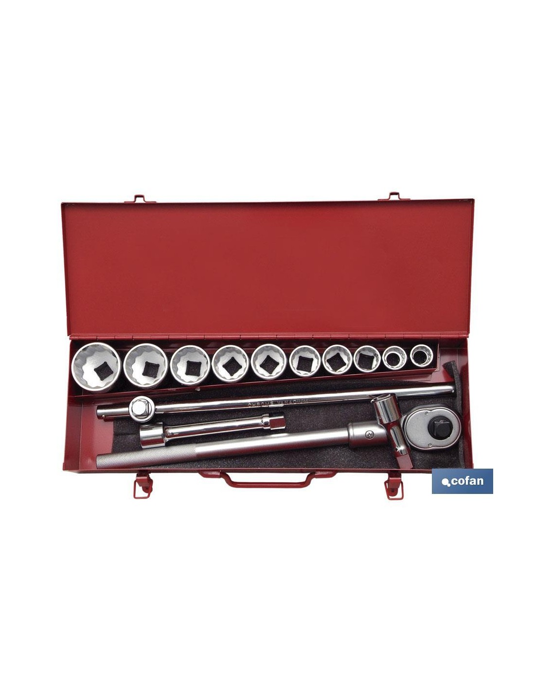 Maletín metálico con juego de carracas de 3/4, incluye 14 piezas extensibles y vasos de 6 o 24 caras en 3/4. Están fabricadas en acero al cromo-vanadio de muy buena calidad, totalmente endurecido y templado, muy duradero y sólido. Este maletín es una herramienta esencial para uso doméstico o industrial. Se usa principalmente para la reparación de automóviles, motocicletas, bicicletas, etc.