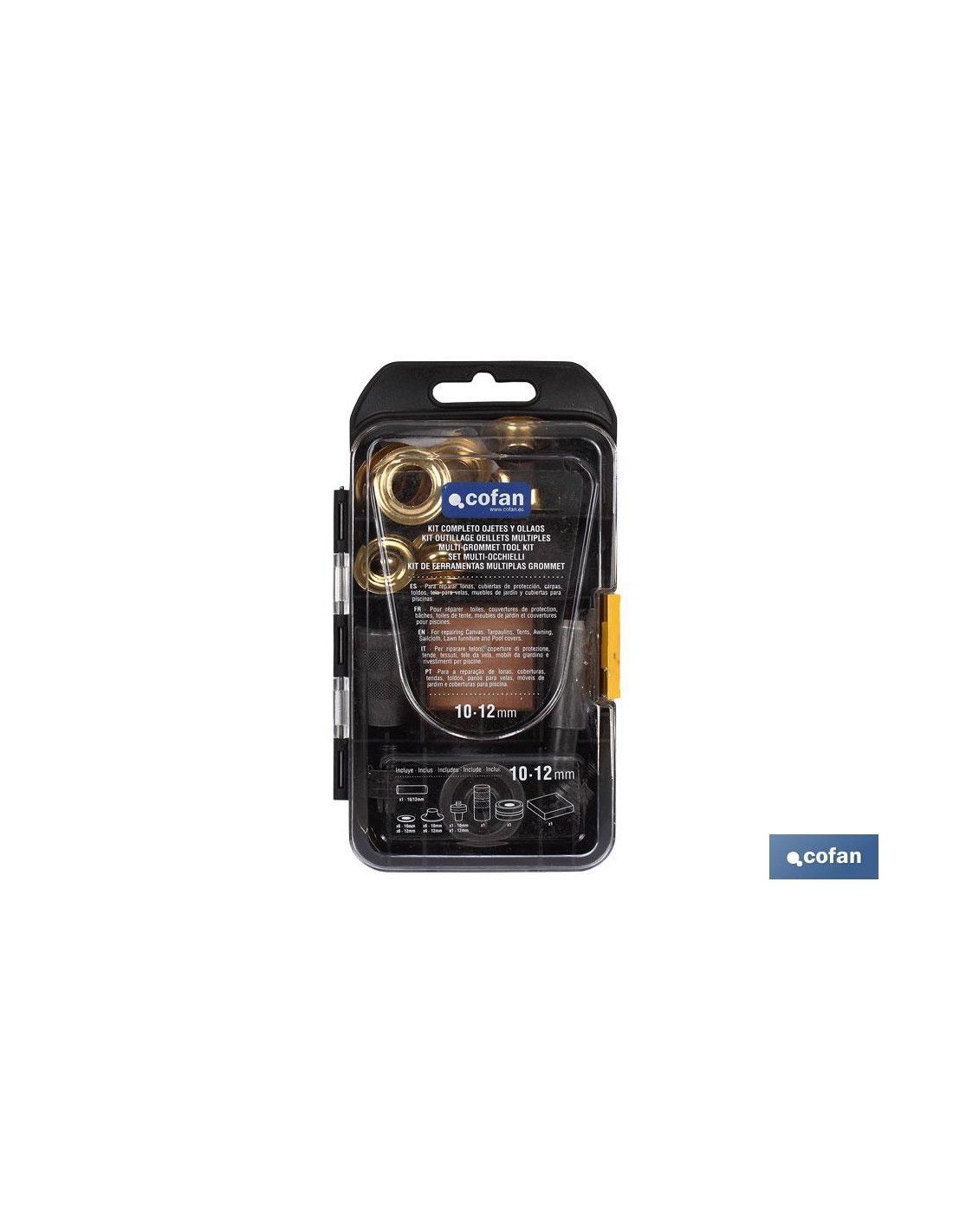 Kit o juego completo de ojetes y ollaos para montajes en telas o lonas. Disponibles en diámetros de 10 y 12 mm de molde. Material metálico y color dorado.