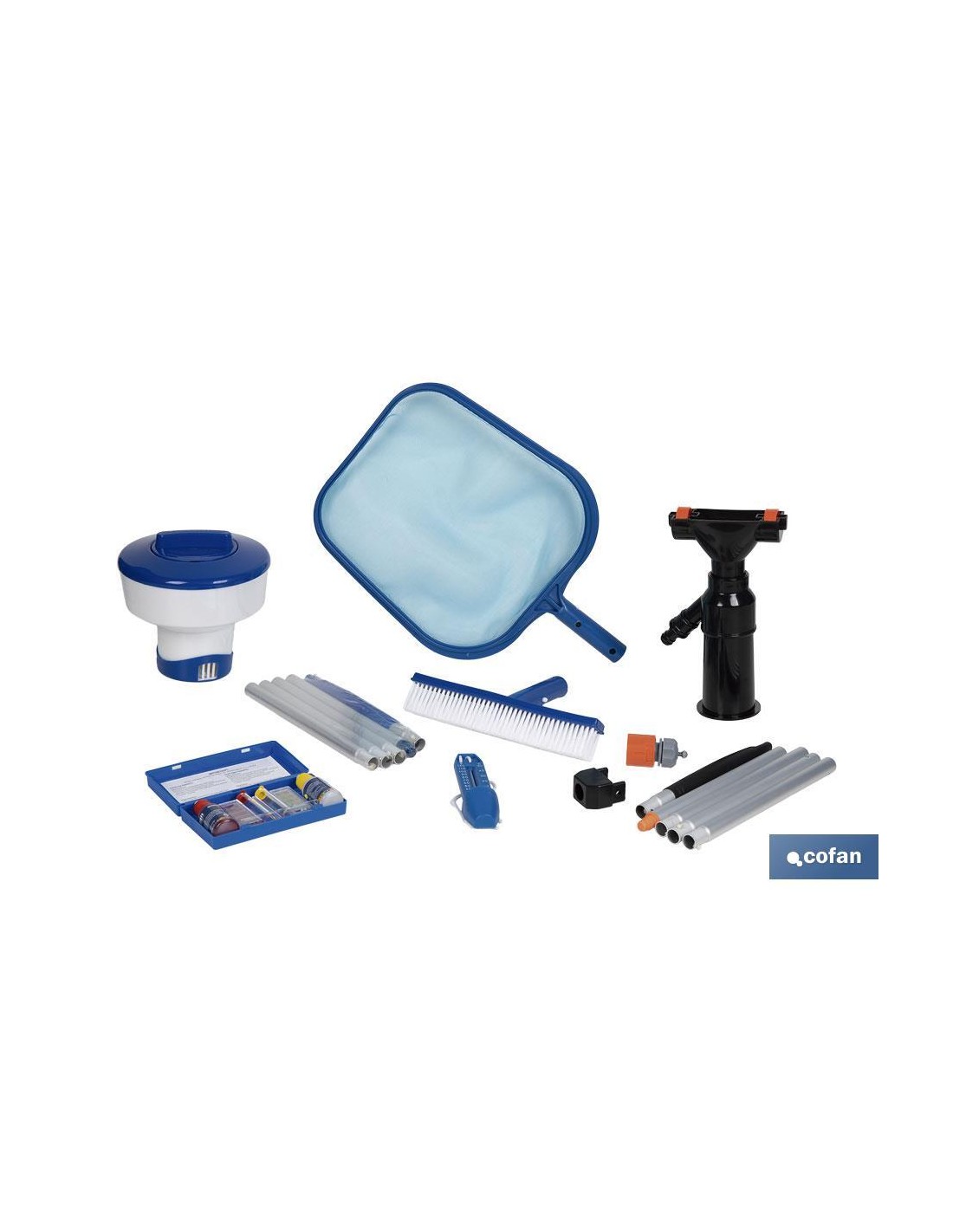 Kit de mantenimiento y limpieza de piscinas con todo lo necesario para hacer el trabajo más eficiente y sin esfuerzo. El kit incluye 6 artículos esenciales para mantener la piscina en perfectas condiciones, facilitando las tareas de limpieza y asegurando un entorno acuático saludable:Cepillo de Paredes y Fondos: Ideal para eliminar la suciedad y las algas adheridas a las superficies de la piscina. Sus cerdas resistentes permiten una limpieza profunda sin dañar el revestimiento, con una medida de 25 x 15 x 14 cm.Recogedor de Hojas con pértiga incluida desmontable: Perfecto para retirar hojas, insectos y otros desechos flotantes de la superficie de la piscina. Su malla fina asegura que ningún residuo quede atrás. La medida es de 43 x 29 x 4,5 cm y la pértiga de 122 cm en 5 secciones.Termómetro: Mantén el control de la temperatura del agua de la piscina con este práctico termómetro fijo, recoge una muestra de agua y comprueba la temperatura. Con una medida de 16,8 x 3 cm y fabricado en polipropileno para un uso duradero.Kit de Pruebas de Agua: Asegura de que el agua de la piscina esté siempre en perfectas condiciones midiendo los niveles de pH y cloro con este sencillo kit de pruebas. Dosificador: Utiliza el dosificador para mantener los niveles de cloro en la piscina, asegurando que el agua se mantenga limpia y libre de contaminantes. Para pastillas de cloro de 200 g. Su medida es de 17,5 cm de diámetro y 19,5 cm de alto.Aspirador con pértiga desmontable: El cuerpo del aspirador está fabricado en ABS de alta calidad, con una medida de 23 x 13,5 cm, mientras que la pértiga está hecha de aluminio resistente con una medida de 120 cm dividida en 5 secciones para alcanzar las áreas más difíciles. Incluye una bolsa recolectora para una limpieza del suelo de la piscina, con sistema de aspiración Venturi, que aprovecha la presión del agua de la manguera para crear succión y recoger toda la suciedad. El kit es adecuado para todo tipo de piscinas. Incluye herramientas que cubren todas las áreas críticas de la limpieza de piscinas, desde la eliminación de hojas y desechos hasta la limpieza de las paredes y el fondo.Los artículos del kit son ligeros y compactos, lo que facilita su almacenamiento cuando no están en uso. Además, su diseño modular permite que ocupen el mínimo espacio posible.