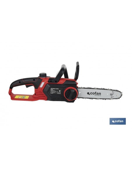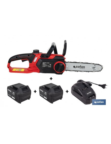 Incluye: Motosierra + 2 baterías 20 V y 4.0 Ah + cargador | RPM: 3000 | Longitud espada: 10 | Velocidad de corte: 7 m/s | Longitud Máxima de Corte: 245 mm | Batería: Litio Li-ion | Voltios: 20 V - 4,0 Ah | Batería - Carga: 50 min | Depósito de engrase: 100 ml