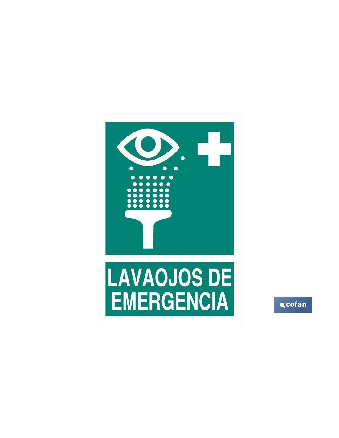Señal de evacuación Lavaojos de emergencia. Pictograma + Texto. Tamaño y material a elegir (luminiscente y adhesivo). El diseño de la señal puede variar, pero en ningún caso se variará el significado de la misma.