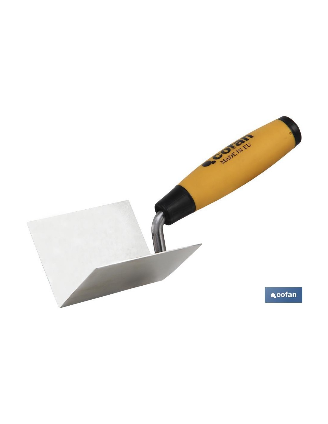 Llana de Inox. especial para esquinas exteriores y interiores. Cuenta con mango bi-componente. Medidas de 80 x 60 mm.