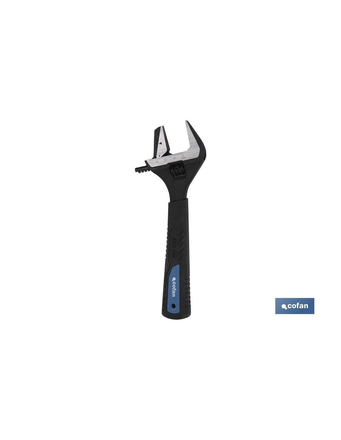 Llave ajustable reversible de gran apertura con moleta central. Mango fabricado en goma de gran confort.