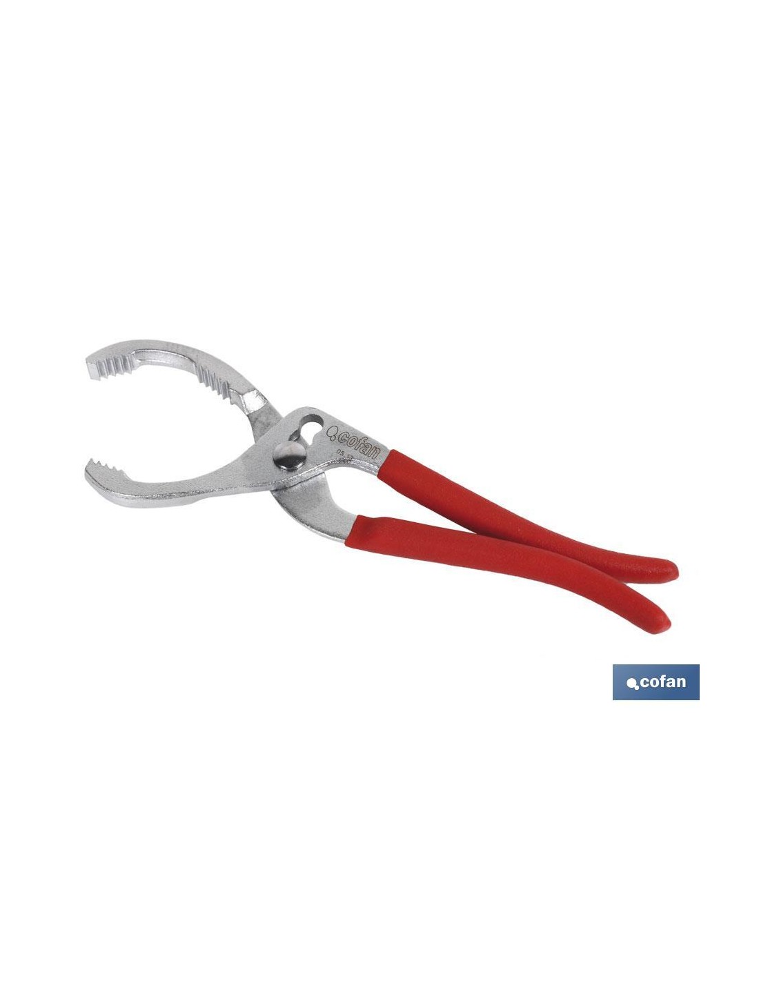Tenaza o llave ajustable ideal para el montaje y desmontaje de filtros de aceite, con diámetros entre Ø60 y Ø110 mm. Herramienta manual que se utiliza para apretar y aflojar elementos filtrantes roscados. Cuerpo de acero pintado en color negro y mango antideslizante de color rojo. El efecto carraca permite un trabajo rápido en espacios reducidos. Diseñada para trabajos profesionales en operaciones de cambios de aceite y filtros.
