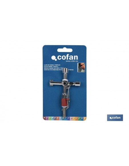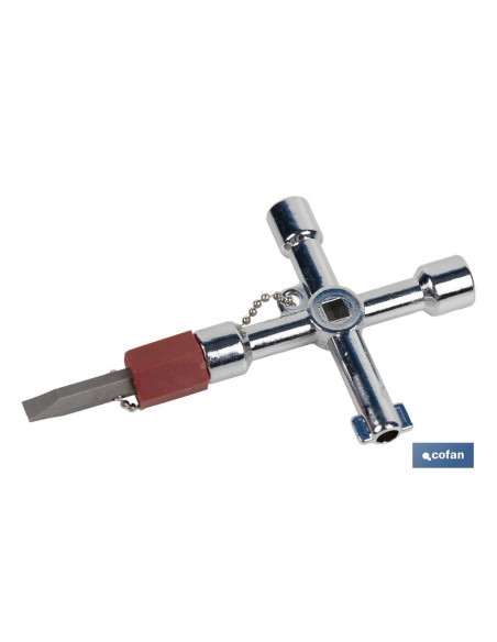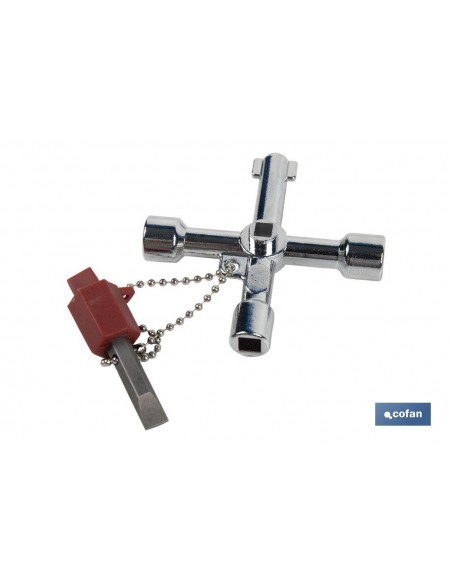 Llave de cabina fabricada en aleación de zinc cromada y diseñada para cumplir con todos tus requisitos en sistemas de paso en construcción y mantenimiento. Esta herramienta esencial es perfecta para trabajar en cuadros eléctricos, sistemas de calefacción, fontanería, climatización, ventilación, electrotécnica, suministro de gas y de agua, sistemas de bloqueo, etc. Equipada con 7 perfiles diferentes, incluyendo 3 cuadrados de 5, 6 y 8 mm (dos de ellos en el centro), una punta plana de 7 mm, una punta Phillips PH2, un triángulo de 10 mm y un círculo con aletas de 9 mm, esta llave te garantiza una adaptabilidad máxima. Incluye también un adaptador de puntas de 1/4 y una cadena para mantener organizados el adaptador de plástico para puntas y la punta doble. Cuenta con un cuadradillo central diseñado para poder ejercer más fuerza. Con un diseño compacto, esta herramienta es fácil de manejar y perfecta para cualquier caja de herramientas. Medidas: 7,5 cm de largo, 7 cm de ancho y 1,40 cm de alto.