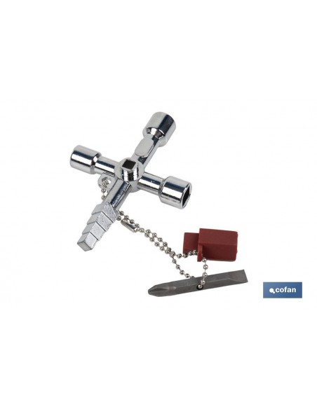 Llave de cabina de 4 brazos fabricada en aleación de zinc cromada y diseñada para cumplir con todos tus requisitos en sistemas de paso en construcción y mantenimiento. Esta herramienta esencial es perfecta para trabajar en cuadros eléctricos, sistemas de calefacción, fontanería, climatización, ventilación, electrotécnica, suministro de gas y de agua, sistemas de bloqueo, etc. Equipada con 10 perfiles diferentes, incluyendo 3 cuadrados de 5, 7 y 8 mm (dos de ellos en el centro), una punta plana de 7 mm, una punta Phillips PH2, un triángulo de 10 mm, 1 cono progresivo de cuadrado macho de 6, 7, 8 y 9 mm y 1 adaptador de puntas de 1/4, esta llave te garantiza una adaptabilidad máxima. Incluye también una cadena para mantener organizados el adaptador de plástico para puntas y una punta con doble huella. Cuenta con un cuadradillo central diseñado para poder ejercer más fuerza. Con un diseño compacto y una longitud total de 8,5 cm, esta herramienta es fácil de manejar y perfecta para cualquier caja de herramientas. Medidas: 8,5 cm de largo, 6 cm de ancho y 1,40 cm de alto.