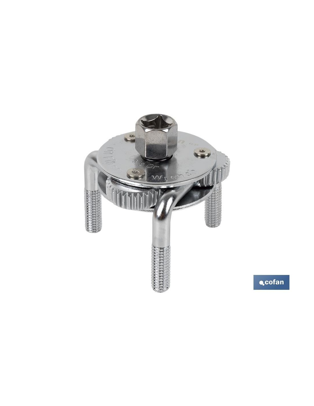 Llave para filtros autorregulable de tres patas curvadas, fabricada en acero cromo vanadio con disposición de medidas desde Ø65 hasta Ø110 mm. Llave de araña para filtro de aceite. Accionamiento con cuadrado macho de 3/8 pulgadas o SW 21. Esta llave de tres garras se puede ajustar en ambas direcciones, tanto para apretar el filtro como para aflojarlo.