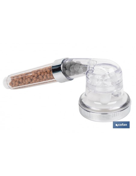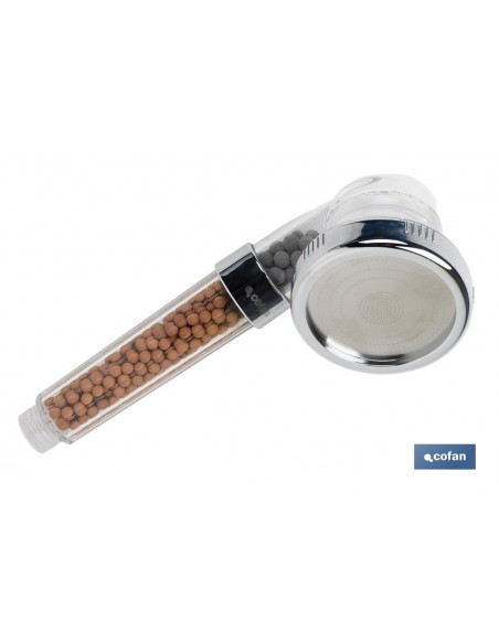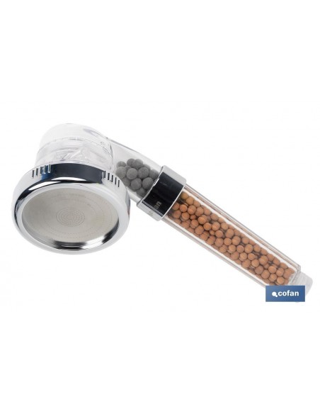 Mango de ducha con filtro iónico y esferas de minerales que emiten iones negativos que purifican el agua, regulan el pH y absorben los restos de cal. El cabezal tiene unos agujeros muy finos que permiten suavizar el agua para darte una buena experiencia de ducha SPA bajo los chorros relajantes. Las esferas incluidas se componen de dos tipos de minerales: unas esferas rojas que mineralizan el agua, aportando beneficios para la piel y unas esferas grises de turmalina que contribuyen a la regularización del pH del agua. Además de purificar el agua y filtrar tanto el cloro como las impurezas, estos minerales permiten mejorar la suavidad de la piel y del cabello, purificar el agua de la ducha, así como proporcionar una sensación de frescura en todo el cuerpo. Puede ahorrar hasta un 30 % de agua. Este mango de ducha está fabricado en acero inoxidable y ABS, e incluye una conexión estándar para la tubería.El cabezal es fácil de instalar, por lo que solo tienes que conectar la tubería a la ducha y girarla en el sentido de las agujas del reloj. También cuenta con tres funciones: lluvia, chorro y masaje. Tiene unas medidas de 22,5 cm de largo y un diámetro del cabezal de 7,9 cm. Peso: 249 g.