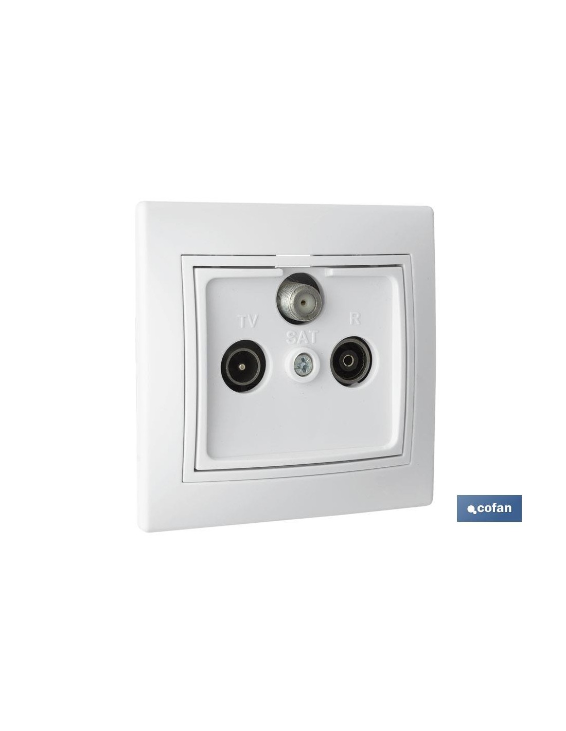 Mecanismo de empotrar modelo Pacific de toma final de TV - Satélite - Radio. Color Blanco. Medidas 83 x 81 mm. Apto para la conexión de cableado de televisión, radio y televisión vía satélite.