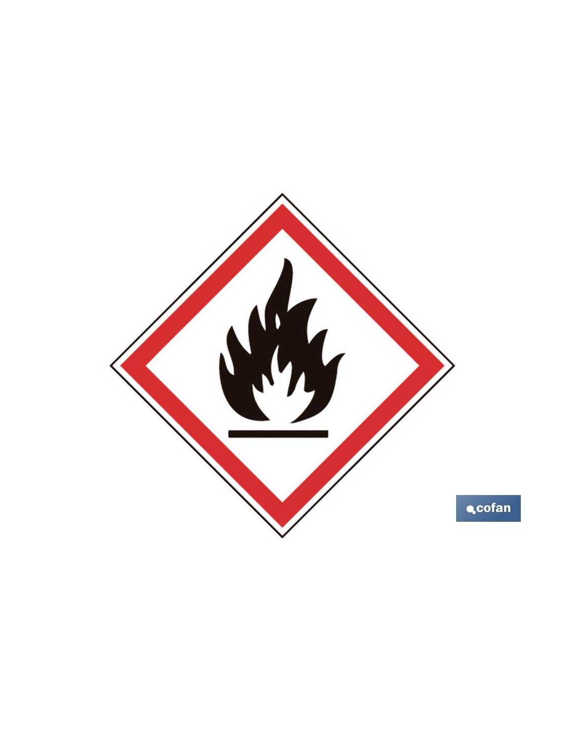 Señalización Adhesivos Residuos Tóxicos PELIGRO DE INCENDIO. Medidas 100x100 mm. El diseño de la señal puede variar, pero en ningún caso se variará el significado de la misma.