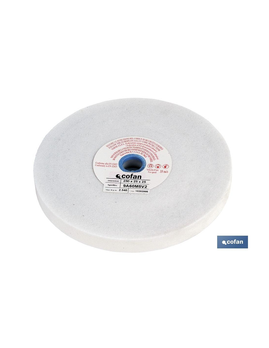 Muelas abrasivas color blanco alta calidad (acero alta aleacción, HSS y aceros para herramientas) para trabajos de desbaste con esmeriladoras. Granos G-60 y G-80. Diámetros desde 150mm hasta 250mm. Espesores desde 16mm hasta 25mm.