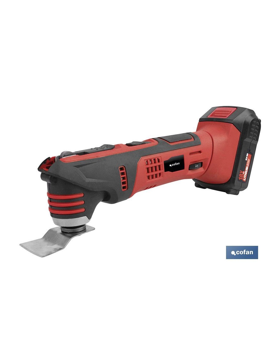 Multiherramienta a batería de Litio Li-ion 18V con sistema de cambio rápido de accesorios. Accesorios incluidos: cargador, bateria, triángulo lijado, sierra y raspador. Permite el corte, raspado y lijado de materiales plásticos, madera, metálicos. Nº RII-AEE de Cofan La Mancha 7038