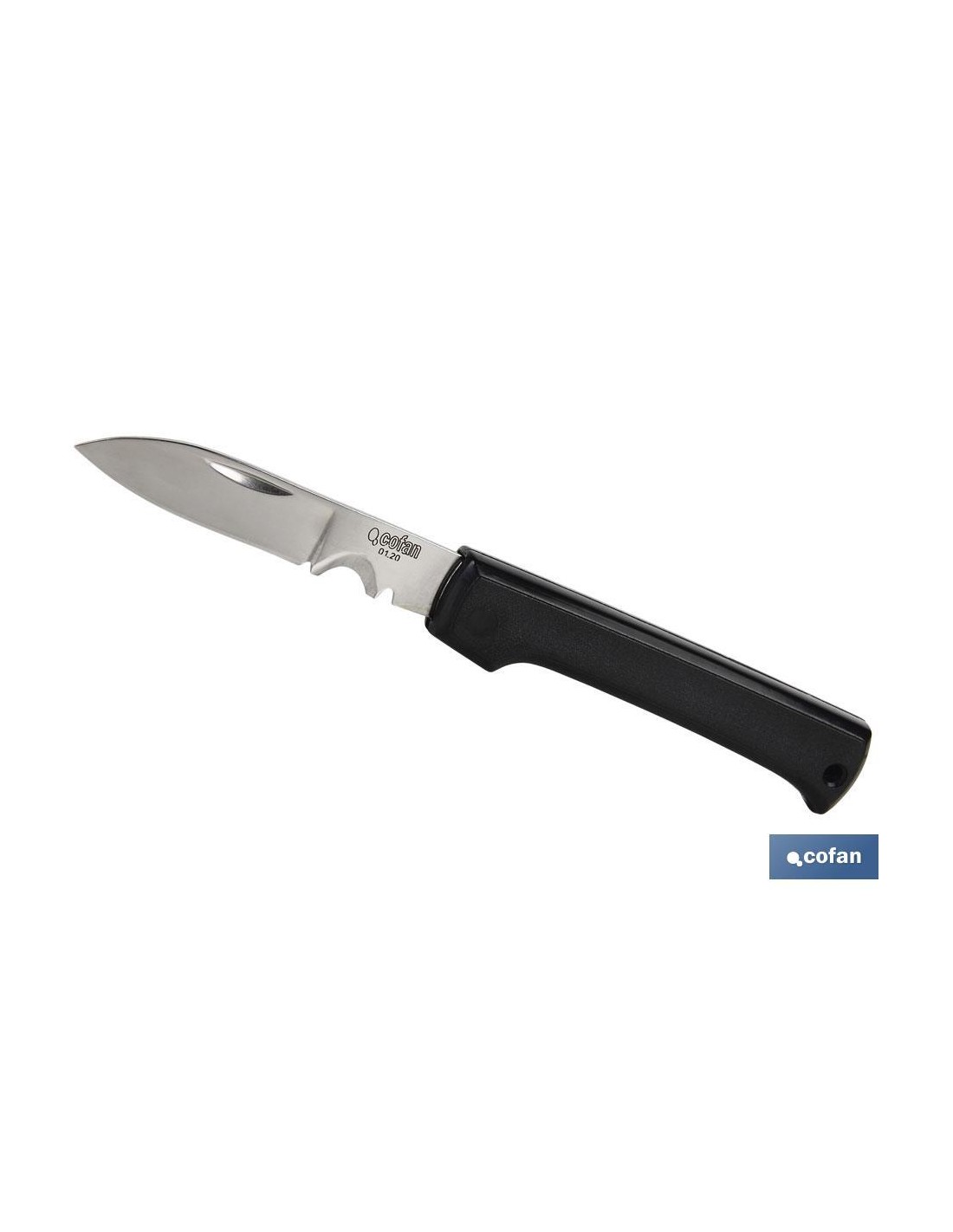 Navaja de electricista fabricada en acero inoxidable con mango ergonómico de plástico y corte estrecho en la base de la cuchilla. Navaja diseñada para trabajos de electricidad, como el pelado del aislamiento del cable eléctrico y el respaldo del esmalte de los conductores. Cuchilla abatible.