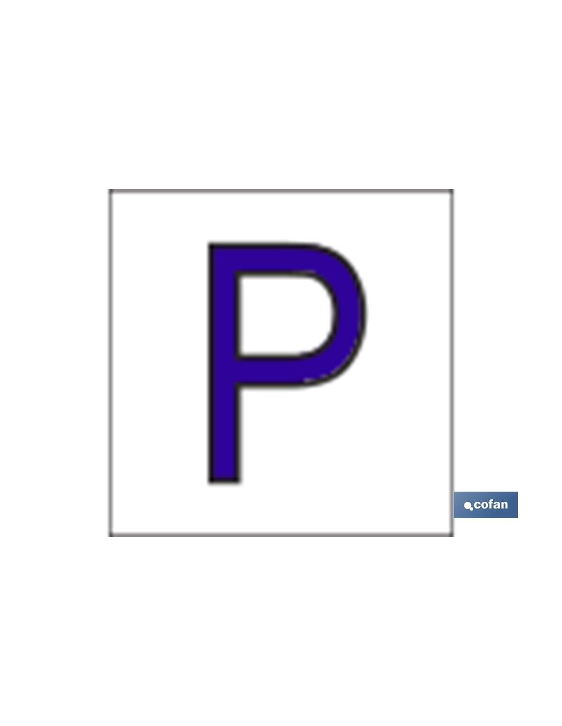 P Letra en glasspack adhesivo con el fondo blanco y carácter azul con medida en 62 x 62mm. El diseño de la señal puede variar, pero en ningún caso se variará el significado de la misma.