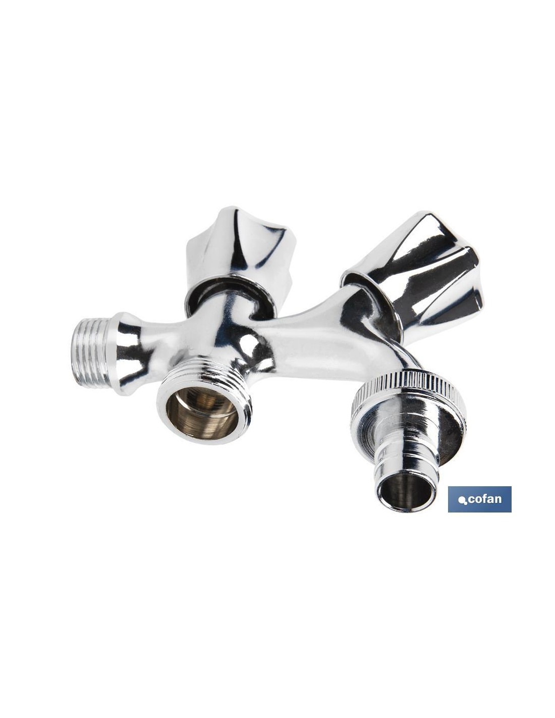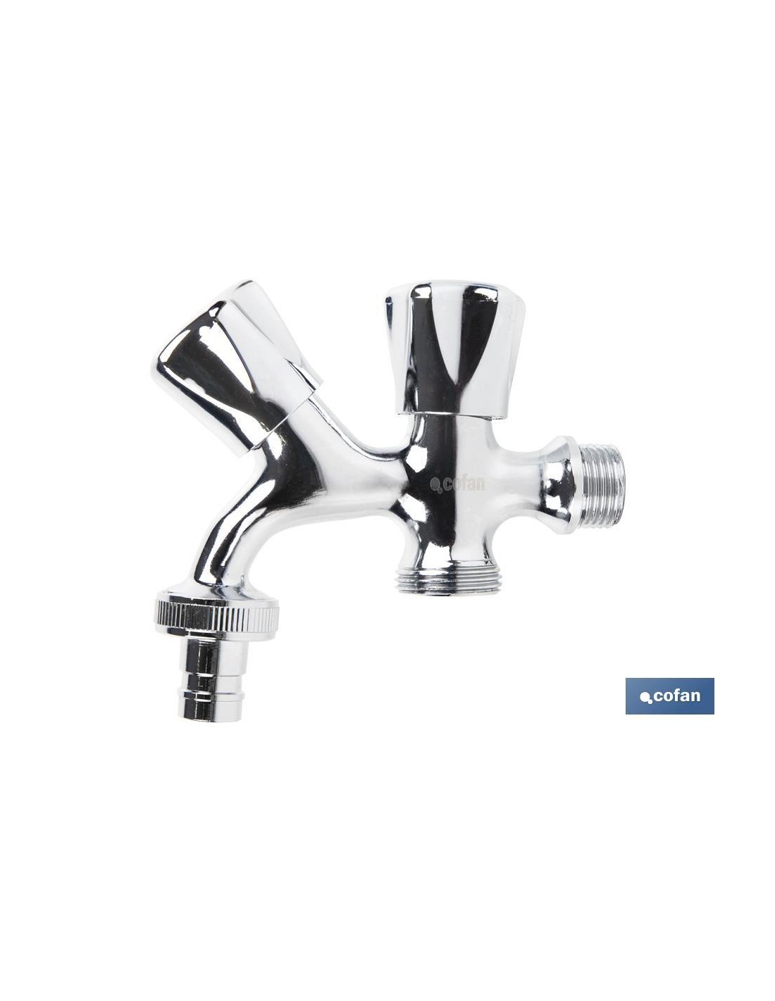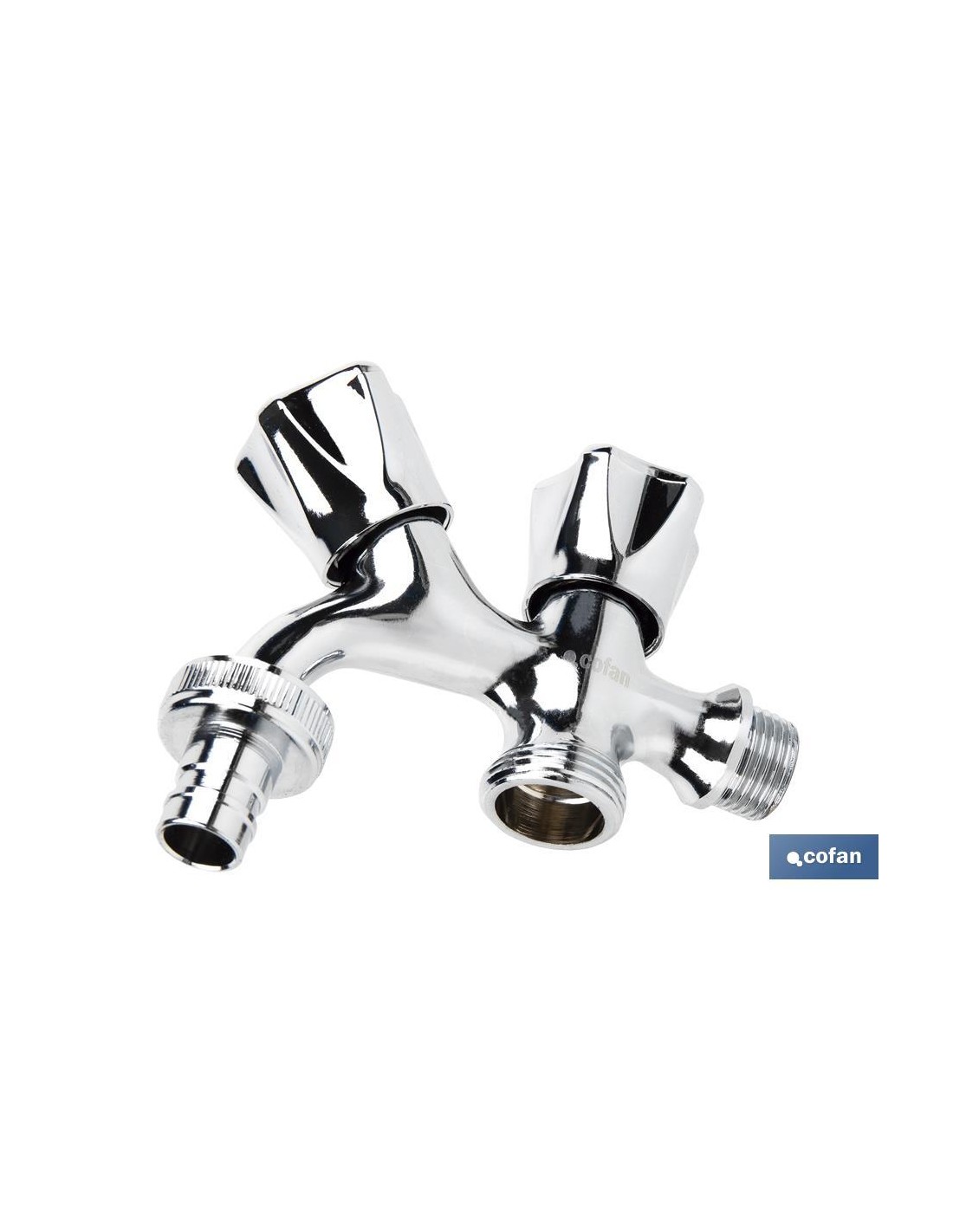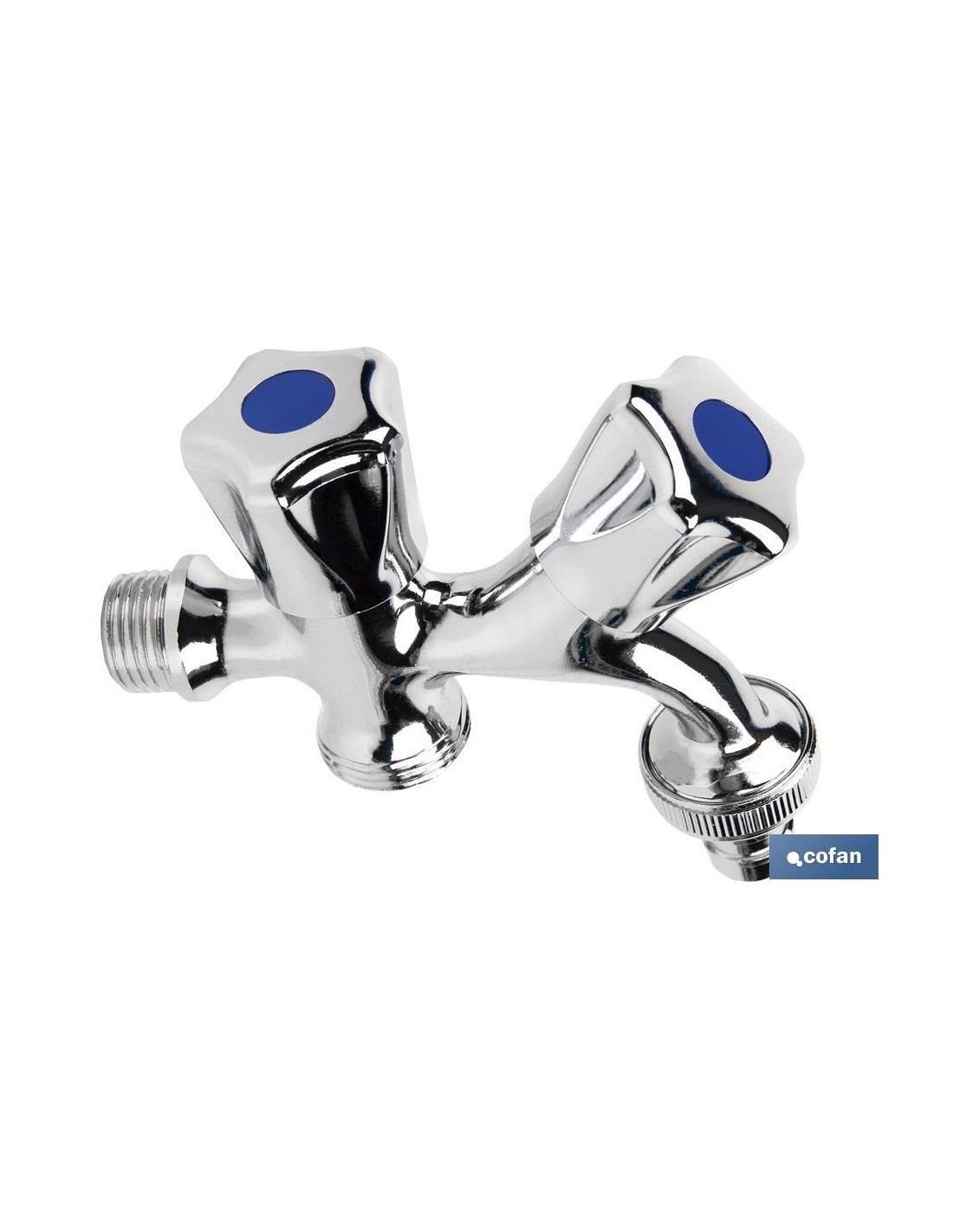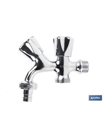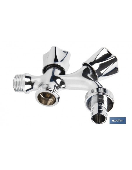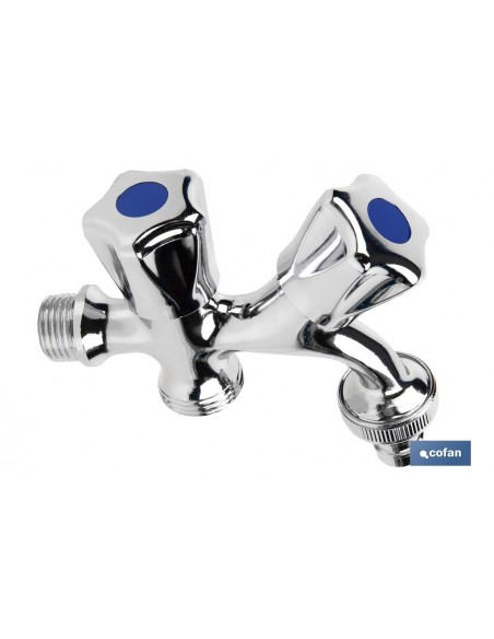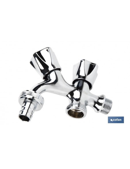 Pack de dos grifos de doble salida de agua para lavadora o lavavajillas. El cuerpo está fabricado en latón con un acabado cromado y manija en ABS. Cuenta con una entrada de rosca de 1/2 y dos salidas de rosca de 3/4"". Proporciona una apertura y cierre rápido gracias a la posición de las válvulas.