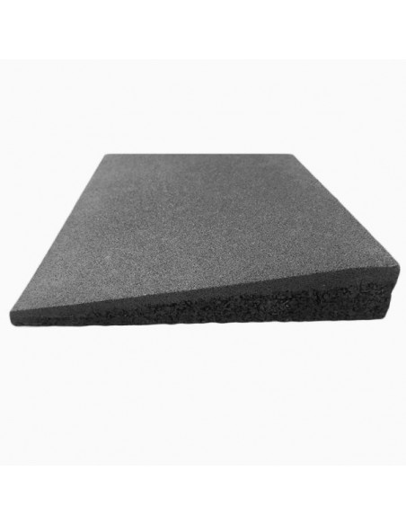 El modelo biselado de la loseta de caucho de Lestare tiene una terminación en pendiente hacia el suelo, ideal para evitar tropiezos y conectarlo bordillos bajos.