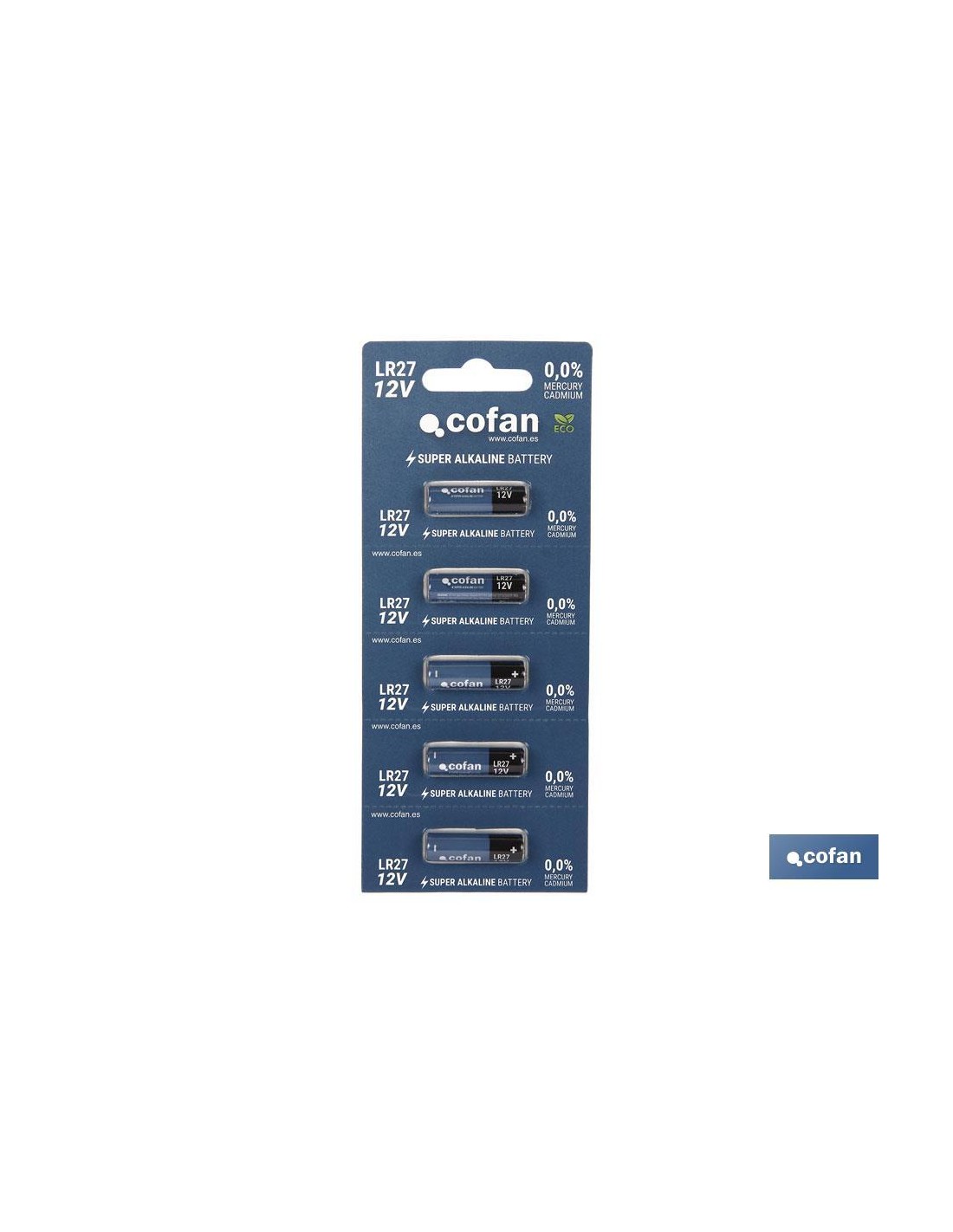 Pilas alcalinas de larga duración 27A/12 V. Blíster de 5 unidades dispensables por unidad. 100% libres de cadmio/mercurio.