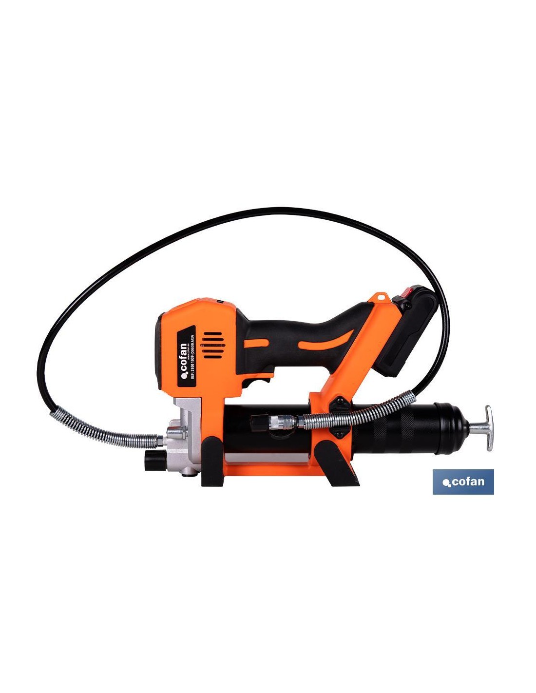 Engrasadora a batería ideal para utilizarse en maquinaria, así como en el sector industria, de automoción y mantenimiento. La herramienta cuenta con una opción de carga manual, carga mediante presión o con cartuchos de 400 ml. La pistola engrasadora se caracteriza por el panel de visualización digital en el que se indica el nivel de carga de la batería, la cantidad de grasa restante en el cartucho, el nivel de velocidad, así como por la descarga de grasa que se lleva a cabo en gramos por impulso. Cuenta con una batería de iones de litio de 21 V 2 Ah capaz de descargar hasta 12 cartuchos de grasa en condiciones de flujo libre. Esta herramienta de engrase se suministra en un maletín que incluye la batería Li-Ion y un cargador rápido de batería que permite cargar el dispositivo durante solo una hora. Además, dispone de una manguera flexible de alta presión de 1 metro de longitud, una boquilla de 4 mordazas y una correa para el fácil transporte de la herramienta. La engrasadora inalámbrica genera una presión de hasta 690 bares.