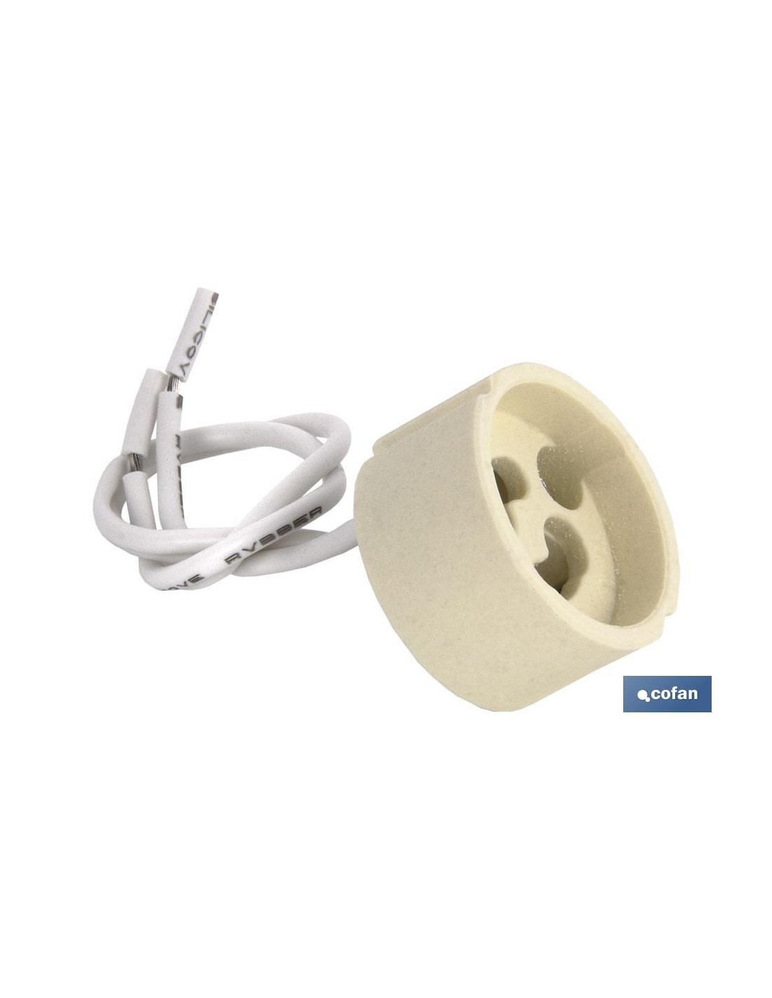 Portalámparas GZ10. 2 A 250 V~. Cerámico de color blanco. Con 150 mm de cable de silicona. Para lámparas GU10 o GZ10. Aplicaciones habituales: Entorno doméstico/terciario interior (Interior de vivienda, oficinas, comercios, etc.).