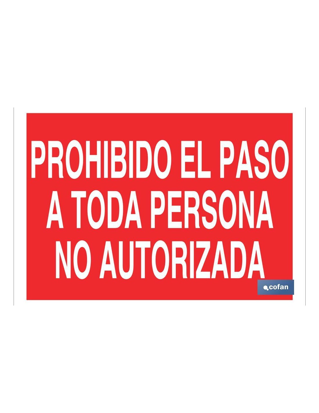 Señal Texto prohibido paso a persona no autorizada en varias medidas y materiales. El diseño de la señal puede variar, pero en ningún caso se variará el significado de la misma.