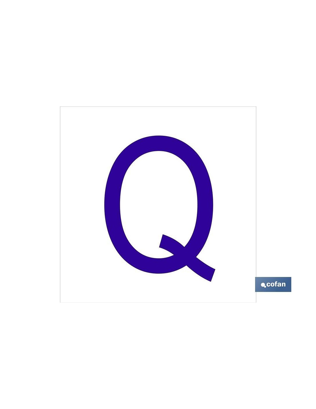 Q Letra en glasspack adhesivo con el fondo blanco y carácter azul con medida en 62 x 62mm. El diseño de la señal puede variar, pero en ningún caso se variará el significado de la misma.