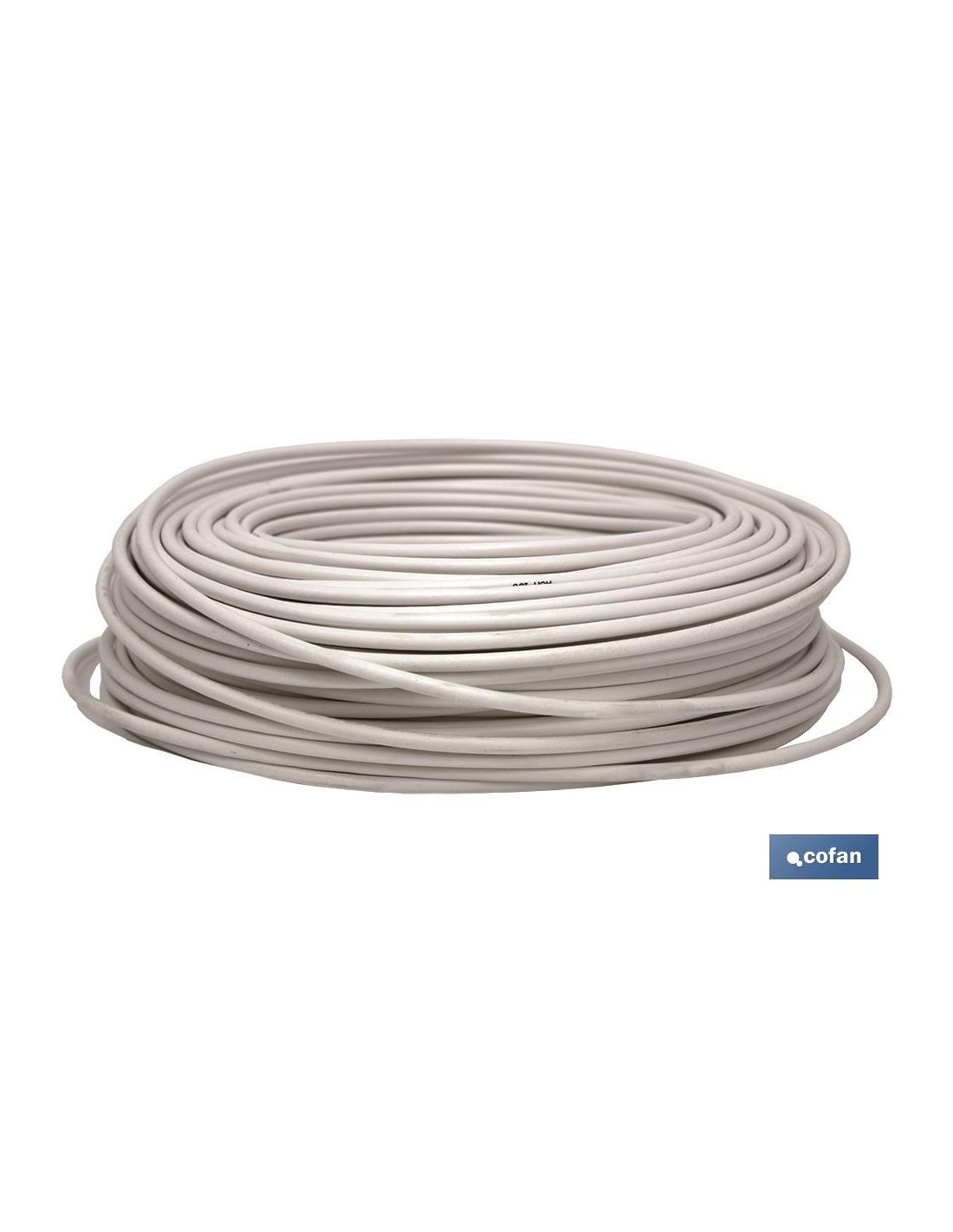 Rollo de cable de antena TV coaxial de alta calidad. Con 75 ohmios. Color blanco. Longitud del rollo de 100 metros. Se utiliza para conectar la TV a la toma de antena.