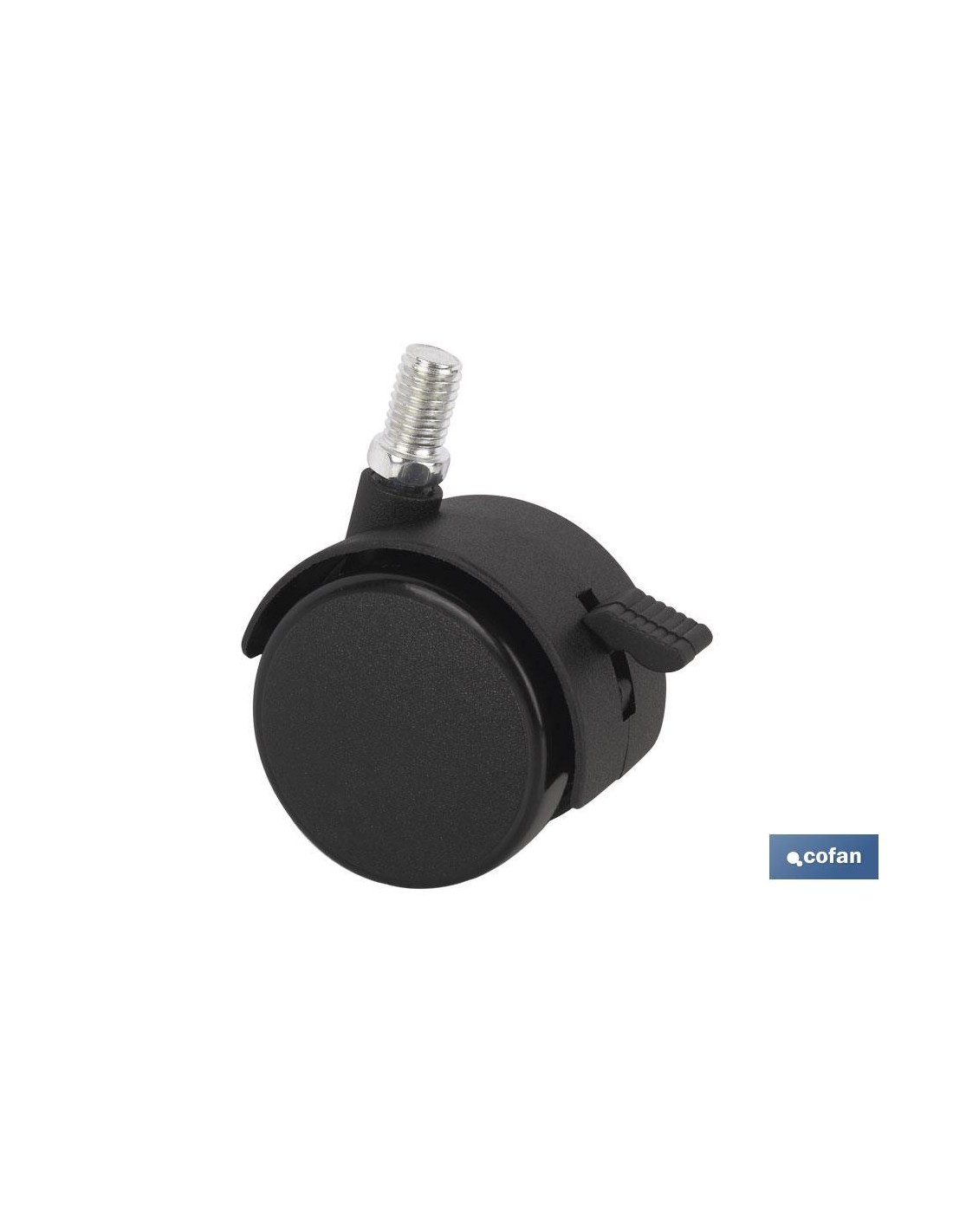 Ruedas plásticas con freno, tornillo con rosca y soporte para encajar dos ruedas gemelas. Ideales para muebles pequeños, expositores, sillas de oficina, estanterías y armarios. Fabricadas en plástico negro y acero cincado. Estas ruedas giratorias están hechas de plástico duro y no arañan el suelo. Pueden, por lo tanto, usarse en suelos de madera sin causar ningún daño.