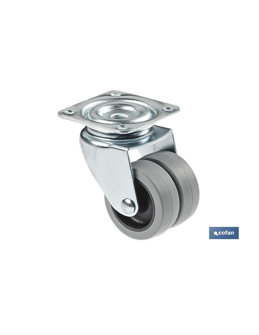 Rueda doble de diámetro Ø 50 mm con placa giratoria, resistente y diseñada para muebles pequeños, equipamientos comerciales, expositores, equipos de música, etc. La rueda ofrece la elasticidad de las ruedas de goma combinada con la resistencia y durabilidad de las ruedas de metal. Rotación de 360 grados para facilitar la rotación en cualquier ángulo. Seguridad para todos los tipos de suelo y muy silenciosa al circular por zonas rugosas.