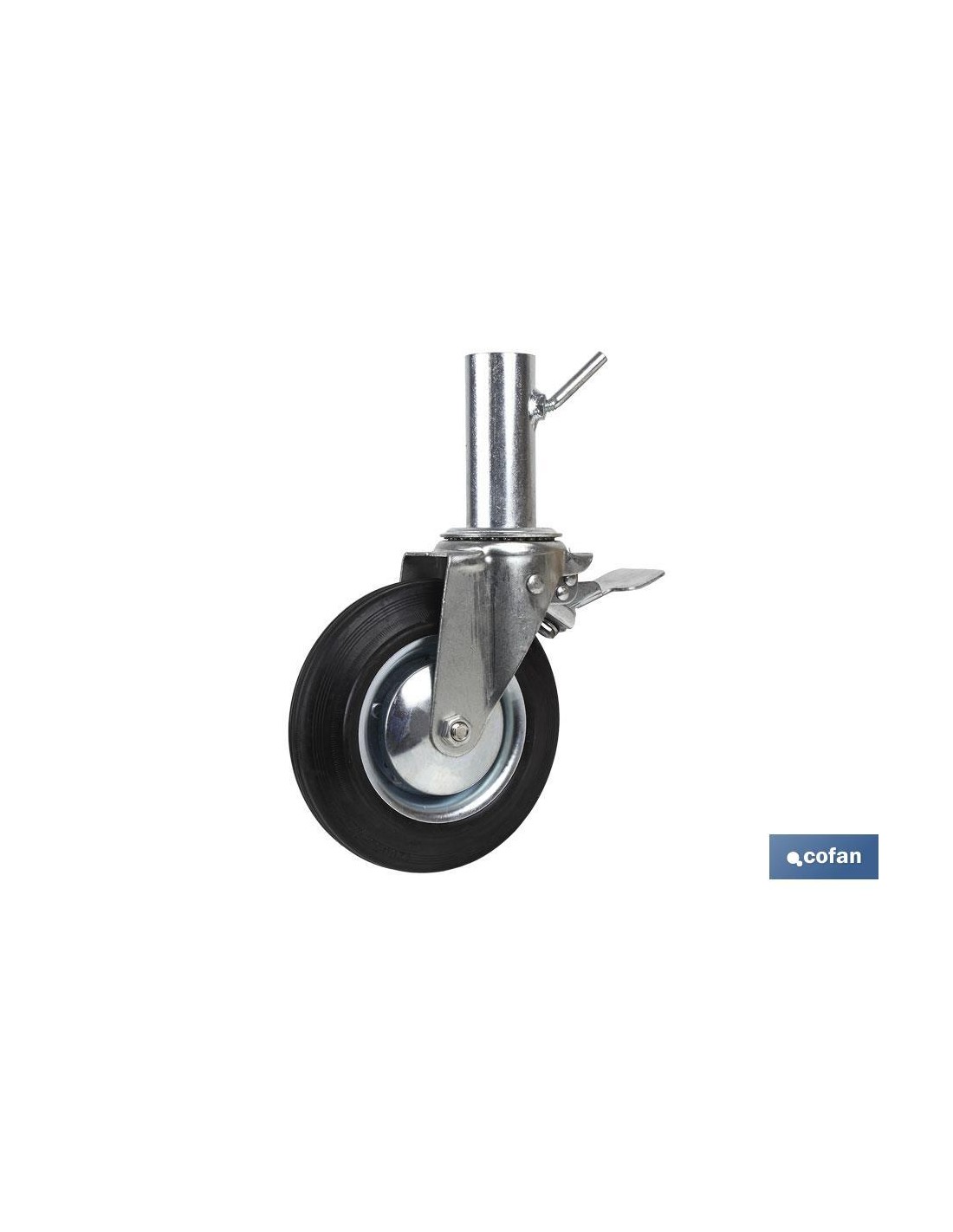 Rueda de Andamio giratoria tubo hembra con freno y medidas de 200 x 50 mm. Rueda especial para andamios con sistema de freno. Rueda especial para mover andamios de construcción. Rueda de goma y entramado de acero metalizado. Peso máximo: 250 kg. Resistente al desgaste y con posibilidad de fijación de freno.